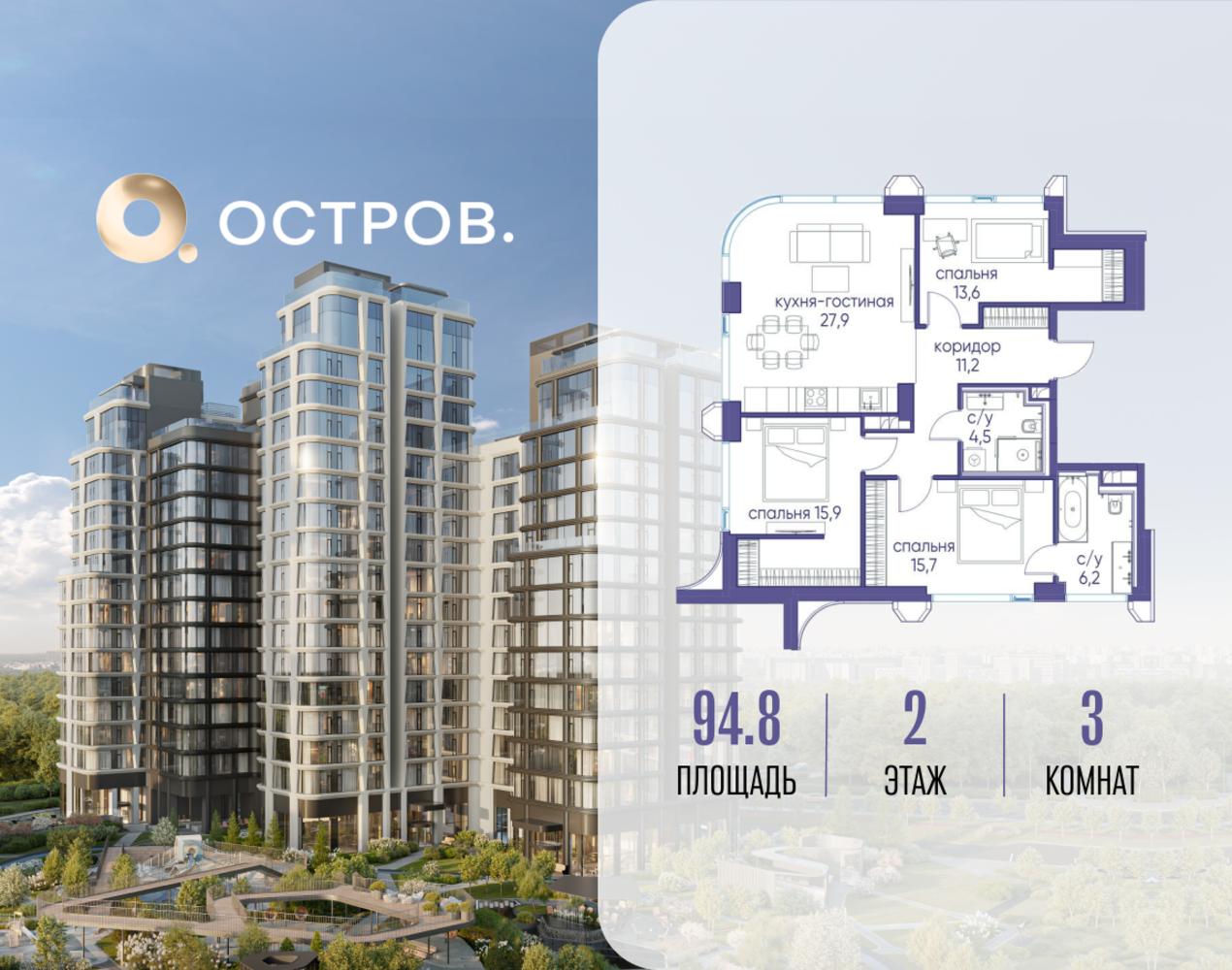 Продаётся 3-комн. квартира от застройщика: общая площадь 94.82 м², жилая 45.20 м², кухня 27.90 м², 2-й этаж, жилой квартал «Остров 12», корпус 1 (секция 3). Срок сдачи: 1 квартал 2029 года. 2 совмещенных санузла. В жилой зоне 2 больших окна на одну сторону, хорошая инсоляция. Позвоните сейчас и забронируйте квартиру! ОСТРОВ от Донстрой — жилой комплекс на западе Москвы, в Мневниковской пойме. Уникальное преимущество комплекса — в том, что он обособлен от города рекой и природным парком (650 га). Благодаря природному окружению эта территория имеет лучший экологический рейтинг в столице. Кварталы ОСТРОВА объединены ландшафтным дизайном в единое пространство — с набережными и Центральным бульваром. На ОСТРОВЕ любые объекты, необходимые для полноценной жизни и отдыха, находятся на расстоянии 15-минутной прогулки. Торговый центр и супермаркеты, кафе и рестораны, фитнес, салоны красоты, школы и детские сады. А также крупнейший в Москве спортивный кластер.