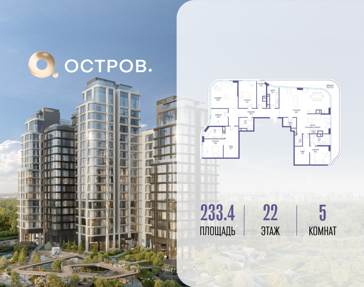 Продаётся квартира от застройщика: общая площадь 233.42 м², жилая 126.90 м², кухня 7.00 м², 22-й этаж, жилой квартал «Остров 12», корпус 3 (секция 1). Срок сдачи: 1 квартал 2029 года. 4 санузла (1 раздельный и 3 совмещенных). В жилой зоне 2 больших окна на одну сторону, хорошая инсоляция. Позвоните сейчас и забронируйте квартиру! ОСТРОВ от Донстрой — жилой комплекс на западе Москвы, в Мневниковской пойме. Уникальное преимущество комплекса — в том, что он обособлен от города рекой и природным парком (650 га). Благодаря природному окружению эта территория имеет лучший экологический рейтинг в столице. Кварталы ОСТРОВА объединены ландшафтным дизайном в единое пространство — с набережными и Центральным бульваром. На ОСТРОВЕ любые объекты, необходимые для полноценной жизни и отдыха, находятся на расстоянии 15-минутной прогулки. Торговый центр и супермаркеты, кафе и рестораны, фитнес, салоны красоты, школы и детские сады. А также крупнейший в Москве спортивный кластер.