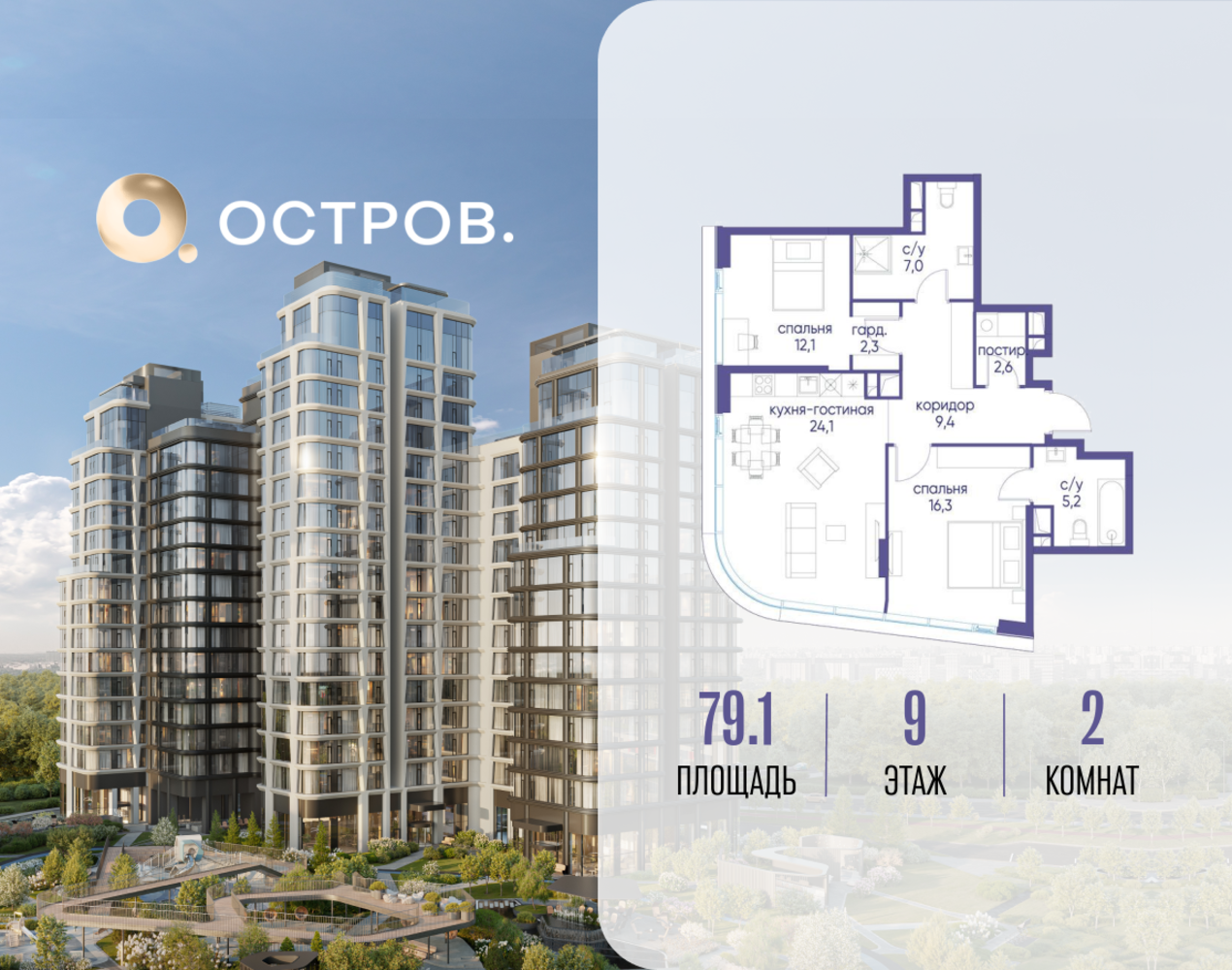 Продаётся 2-комн. квартира от застройщика: общая площадь 79.12 м², жилая 28.40 м², кухня 24.10 м², 9-й этаж, жилой квартал «Остров 12», корпус 6 (секция 1). Срок сдачи: 1 квартал 2029 года. 2 совмещенных санузла. В жилой зоне 2 больших окна на одну сторону, хорошая инсоляция. Позвоните сейчас и забронируйте квартиру! ОСТРОВ от Донстрой — жилой комплекс на западе Москвы, в Мневниковской пойме. Уникальное преимущество комплекса — в том, что он обособлен от города рекой и природным парком (650 га). Благодаря природному окружению эта территория имеет лучший экологический рейтинг в столице. Кварталы ОСТРОВА объединены ландшафтным дизайном в единое пространство — с набережными и Центральным бульваром. На ОСТРОВЕ любые объекты, необходимые для полноценной жизни и отдыха, находятся на расстоянии 15-минутной прогулки. Торговый центр и супермаркеты, кафе и рестораны, фитнес, салоны красоты, школы и детские сады. А также крупнейший в Москве спортивный кластер.