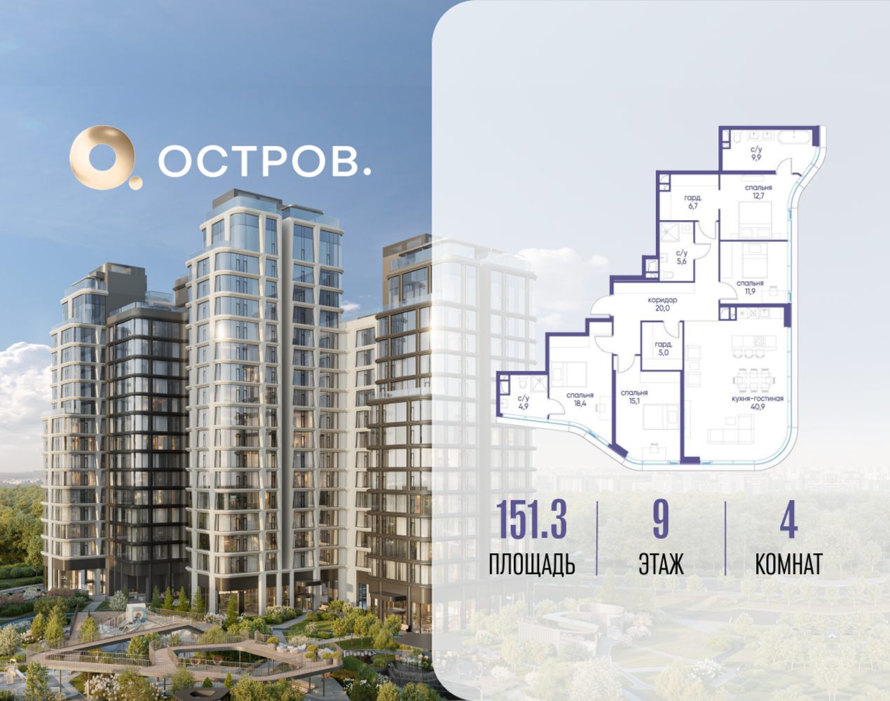 Продаётся 4-комн. квартира от застройщика: общая площадь 151.32 м², жилая 58.10 м², кухня 40.90 м², 9-й этаж, жилой квартал «Остров 12», корпус 6 (секция 1). Срок сдачи: 1 квартал 2029 года. 3 совмещенных санузла. В жилой зоне 2 больших окна на одну сторону, хорошая инсоляция. Позвоните сейчас и забронируйте квартиру! ОСТРОВ от Донстрой — жилой комплекс на западе Москвы, в Мневниковской пойме. Уникальное преимущество комплекса — в том, что он обособлен от города рекой и природным парком (650 га). Благодаря природному окружению эта территория имеет лучший экологический рейтинг в столице. Кварталы ОСТРОВА объединены ландшафтным дизайном в единое пространство — с набережными и Центральным бульваром. На ОСТРОВЕ любые объекты, необходимые для полноценной жизни и отдыха, находятся на расстоянии 15-минутной прогулки. Торговый центр и супермаркеты, кафе и рестораны, фитнес, салоны красоты, школы и детские сады. А также крупнейший в Москве спортивный кластер.