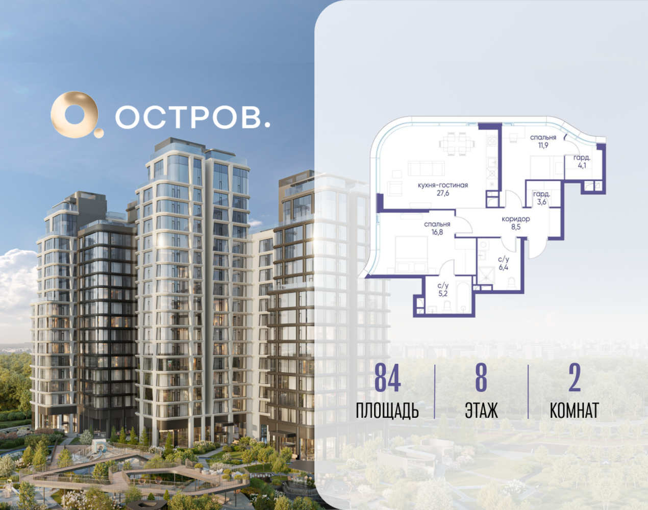 Продаётся 2-комн. квартира от застройщика: общая площадь 84.02 м², жилая 28.70 м², кухня 27.60 м², 8-й этаж, жилой квартал «Остров 12», корпус 6 (секция 1). Срок сдачи: 1 квартал 2029 года. 2 совмещенных санузла. В жилой зоне 2 больших окна на одну сторону, хорошая инсоляция. Позвоните сейчас и забронируйте квартиру! ОСТРОВ от Донстрой — жилой комплекс на западе Москвы, в Мневниковской пойме. Уникальное преимущество комплекса — в том, что он обособлен от города рекой и природным парком (650 га). Благодаря природному окружению эта территория имеет лучший экологический рейтинг в столице. Кварталы ОСТРОВА объединены ландшафтным дизайном в единое пространство — с набережными и Центральным бульваром. На ОСТРОВЕ любые объекты, необходимые для полноценной жизни и отдыха, находятся на расстоянии 15-минутной прогулки. Торговый центр и супермаркеты, кафе и рестораны, фитнес, салоны красоты, школы и детские сады. А также крупнейший в Москве спортивный кластер.