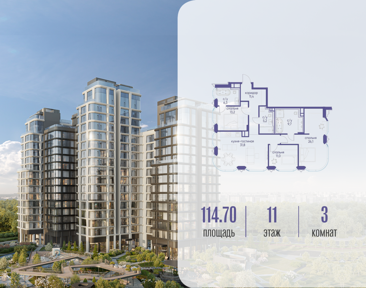 Продаётся 3-комн. квартира от застройщика: общая площадь 114.72 м², жилая 50.30 м², кухня 31.80 м², 11-й этаж, жилой квартал «Остров 12», корпус 2 (секция 1). Срок сдачи: 1 квартал 2029 года. 3 совмещенных санузла. В жилой зоне 2 больших окна на одну сторону, хорошая инсоляция. Позвоните сейчас и забронируйте квартиру! ОСТРОВ от Донстрой — жилой комплекс на западе Москвы, в Мневниковской пойме. Уникальное преимущество комплекса — в том, что он обособлен от города рекой и природным парком (650 га). Благодаря природному окружению эта территория имеет лучший экологический рейтинг в столице. Кварталы ОСТРОВА объединены ландшафтным дизайном в единое пространство — с набережными и Центральным бульваром. На ОСТРОВЕ любые объекты, необходимые для полноценной жизни и отдыха, находятся на расстоянии 15-минутной прогулки. Торговый центр и супермаркеты, кафе и рестораны, фитнес, салоны красоты, школы и детские сады. А также крупнейший в Москве спортивный кластер.