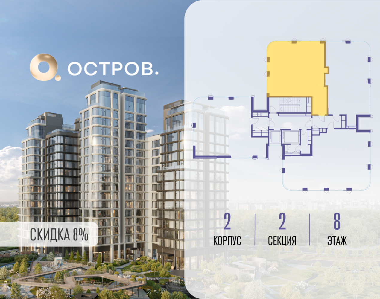 Скидка до 8% действует до 15.04.2026 г. при 100% оплате и не субсидированной ипотеке. Продаётся 2-комн. квартира от застройщика: общая площадь 86.72 м², жилая 30.90 м², кухня 35.30 м², 8-й этаж, жилой квартал «Остров 12», корпус 2 (секция 2). Срок сдачи: 1 квартал 2029 года. 2 совмещенных санузла. В жилой зоне 2 больших окна на одну сторону, хорошая инсоляция. Позвоните сейчас и забронируйте квартиру! ОСТРОВ от Донстрой — жилой комплекс на западе Москвы, в Мневниковской пойме. Уникальное преимущество комплекса — в том, что он обособлен от города рекой и природным парком (650 га). Благодаря природному окружению эта территория имеет лучший экологический рейтинг в столице. Кварталы ОСТРОВА объединены ландшафтным дизайном в единое пространство — с набережными и Центральным бульваром. На ОСТРОВЕ любые объекты, необходимые для полноценной жизни и отдыха, находятся на расстоянии 15-минутной прогулки. Торговый центр и супермаркеты, кафе и рестораны, фитнес, салоны красоты, школы и детские сады. А также крупнейший в Москве спортивный кластер.
