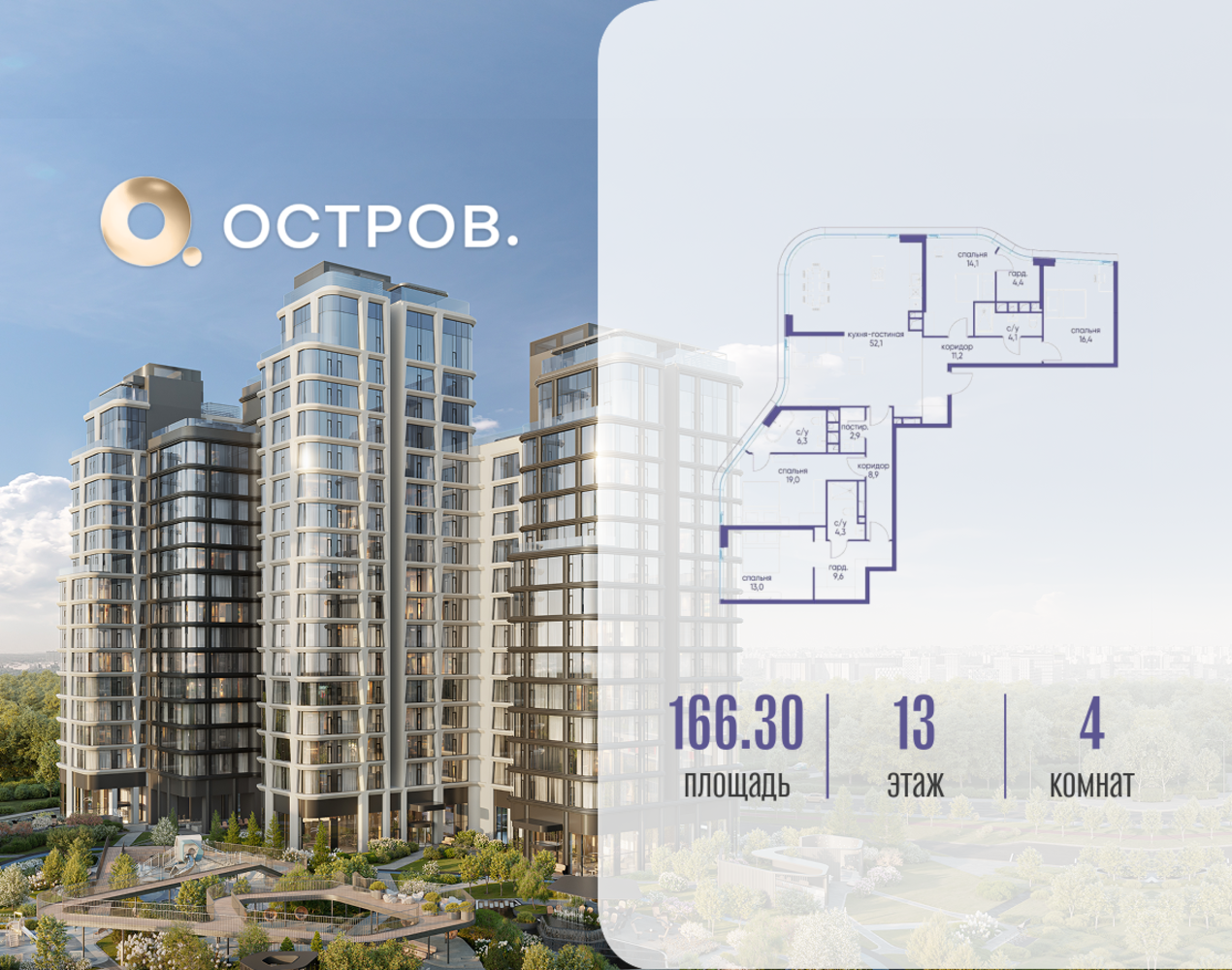 Продаётся 4-комн. квартира от застройщика: общая площадь 166.32 м², жилая 62.50 м², кухня 52.10 м², 13-й этаж, жилой квартал «Остров 12», корпус 6 (секция 1). Срок сдачи: 1 квартал 2029 года. 3 совмещенных санузла. В жилой зоне 2 больших окна на одну сторону, хорошая инсоляция. Позвоните сейчас и забронируйте квартиру! ОСТРОВ от Донстрой — жилой комплекс на западе Москвы, в Мневниковской пойме. Уникальное преимущество комплекса — в том, что он обособлен от города рекой и природным парком (650 га). Благодаря природному окружению эта территория имеет лучший экологический рейтинг в столице. Кварталы ОСТРОВА объединены ландшафтным дизайном в единое пространство — с набережными и Центральным бульваром. На ОСТРОВЕ любые объекты, необходимые для полноценной жизни и отдыха, находятся на расстоянии 15-минутной прогулки. Торговый центр и супермаркеты, кафе и рестораны, фитнес, салоны красоты, школы и детские сады. А также крупнейший в Москве спортивный кластер.