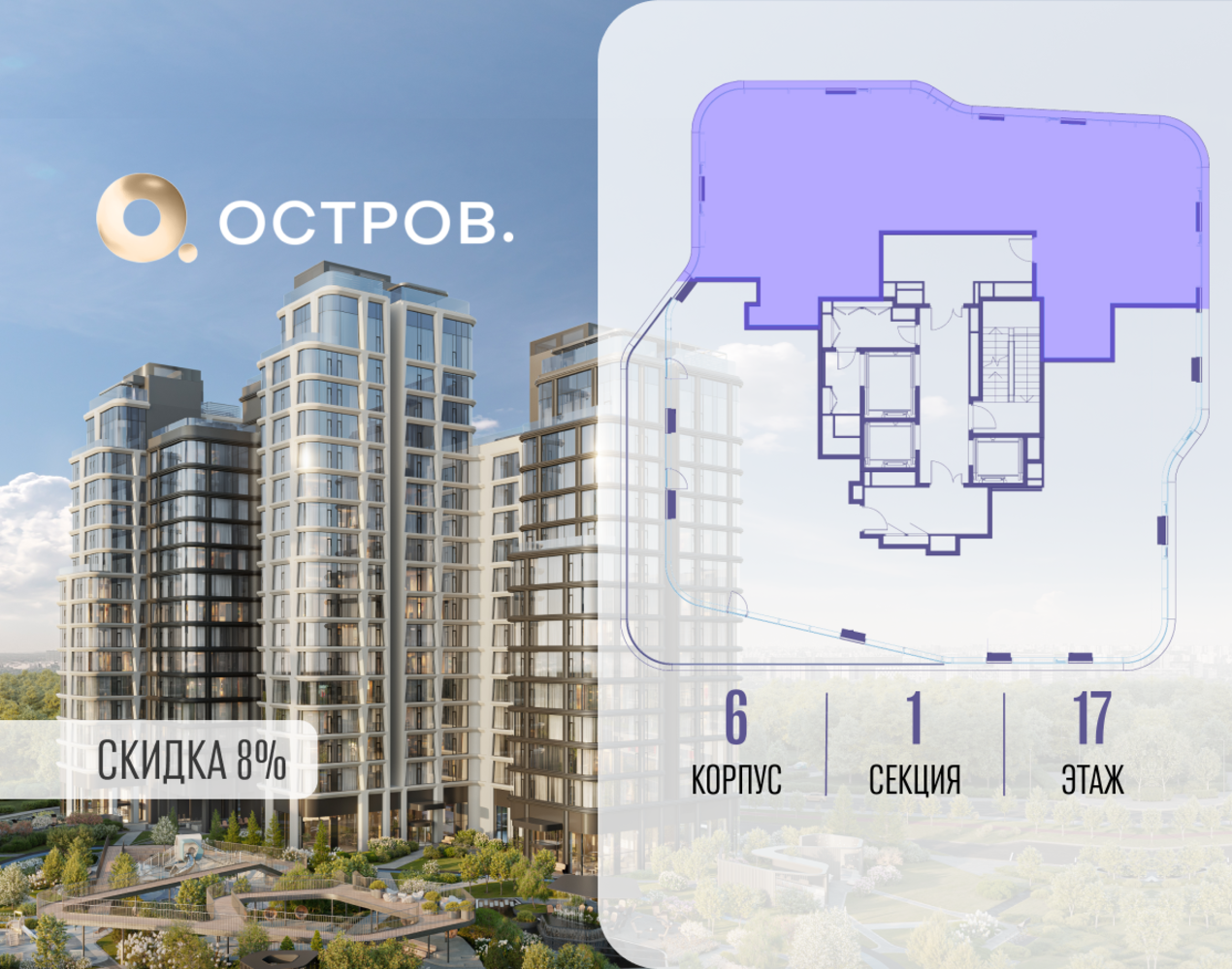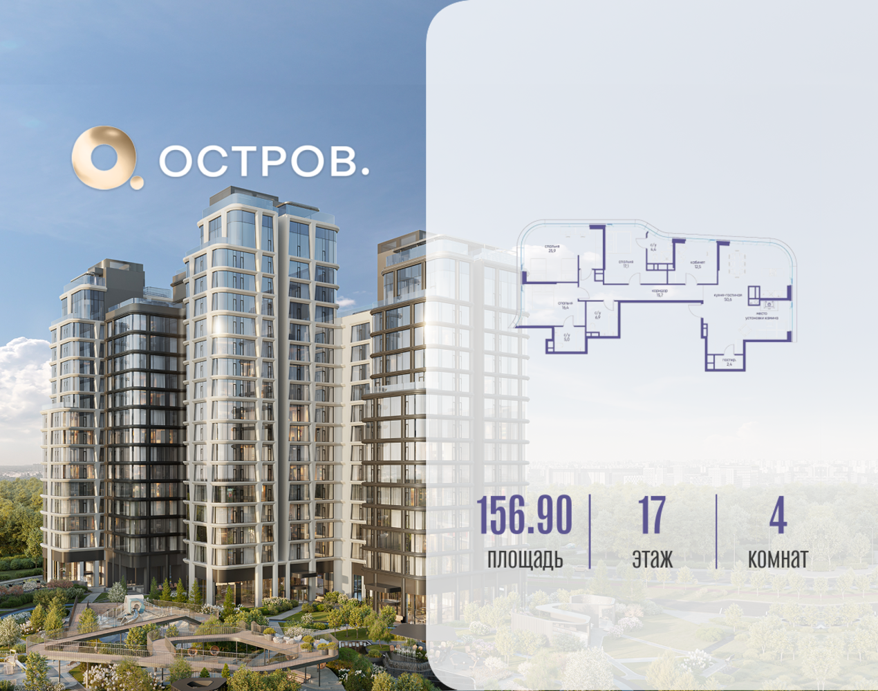 Продаётся 4-комн. квартира от застройщика: общая площадь 156.92 м², жилая 71.90 м², кухня 50.60 м², 17-й этаж, жилой квартал «Остров 12», корпус 6 (секция 1). Срок сдачи: 1 квартал 2029 года. 3 совмещенных санузла. В жилой зоне 2 больших окна на одну сторону, хорошая инсоляция. Позвоните сейчас и забронируйте квартиру! ОСТРОВ от Донстрой — жилой комплекс на западе Москвы, в Мневниковской пойме. Уникальное преимущество комплекса — в том, что он обособлен от города рекой и природным парком (650 га). Благодаря природному окружению эта территория имеет лучший экологический рейтинг в столице. Кварталы ОСТРОВА объединены ландшафтным дизайном в единое пространство — с набережными и Центральным бульваром. На ОСТРОВЕ любые объекты, необходимые для полноценной жизни и отдыха, находятся на расстоянии 15-минутной прогулки. Торговый центр и супермаркеты, кафе и рестораны, фитнес, салоны красоты, школы и детские сады. А также крупнейший в Москве спортивный кластер.