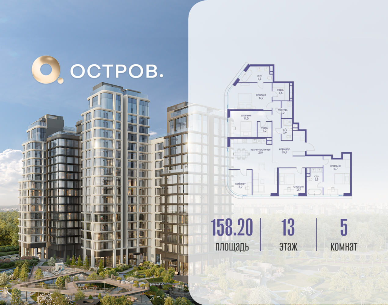 Продаётся квартира от застройщика: общая площадь 158.22 м², жилая 70.20 м², кухня 31.90 м², 13-й этаж, жилой квартал «Остров 12», корпус 3 (секция 1). Срок сдачи: 1 квартал 2029 года. 3 совмещенных санузла. В жилой зоне 2 больших окна на одну сторону, хорошая инсоляция. Позвоните сейчас и забронируйте квартиру! ОСТРОВ от Донстрой — жилой комплекс на западе Москвы, в Мневниковской пойме. Уникальное преимущество комплекса — в том, что он обособлен от города рекой и природным парком (650 га). Благодаря природному окружению эта территория имеет лучший экологический рейтинг в столице. Кварталы ОСТРОВА объединены ландшафтным дизайном в единое пространство — с набережными и Центральным бульваром. На ОСТРОВЕ любые объекты, необходимые для полноценной жизни и отдыха, находятся на расстоянии 15-минутной прогулки. Торговый центр и супермаркеты, кафе и рестораны, фитнес, салоны красоты, школы и детские сады. А также крупнейший в Москве спортивный кластер.