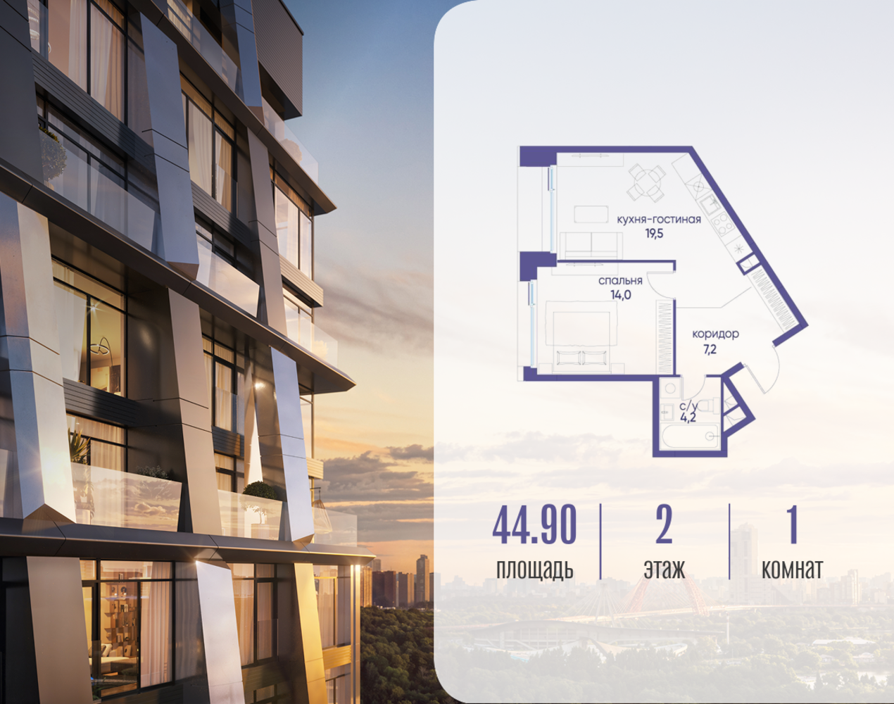 Продаётся однокомнатная квартира от застройщика: общая площадь 44.92 м², жилая 14.00 м², кухня 19.50 м², 2, жилой квартал «Остров 12», корпус 1 (12.1 квартал) (секция 1). срок сдачи: 4-кв. 2025. , 1 совмещенный санузел. В жилой зоне 2 больших окна на одну сторону, хорошая инсоляция. Позвоните сейчас и забронируйте квартиру! Купите квартиру для курортной жизни в Москве в квартале ОСТРОВ.12.1. Это единственный на ОСТРОВЕ квартал бизнес-класса, расположенный на первой линии у реки - здесь царит атмосфера ежедневного отпуска. Дома созданы в узнаваемом футуристичном стиле и выглядят как произведения современного искусства. Для жителей предусмотрены фитнес-рум и детский клуб, гостиная и кинотеатр, переговорные и репетиторские комнаты. На крышах устроены видовые общественные пространства с зонами для йоги, коворкингами, лаунжами. Двор-парк располагает всем необходимым для отдыха и общения всех возрастов. ОСТРОВ.12.1 - часть жилого комплекса на западе Москвы, в 15 минутах езды от центра. Это настоящий заповедник посреди большого города, в окружении реки и 650 га заповедников. Здесь все необходимое находится по соседству: от детского сада до супермаркета, от фитнес-зала до серфинг-центра. На территории созданы все условия для отдыха и общения: клубная инфраструктура в домах и дворы-парки, набережные и променады, маршруты для спортсменов, детей и возрастных жителей. В нескольких минутах ходьбы расположена станция метро "Мнёвники" БКЛ. На автомобиле - 10 минут до Москва-Сити и 15 минут до Садового кольца.