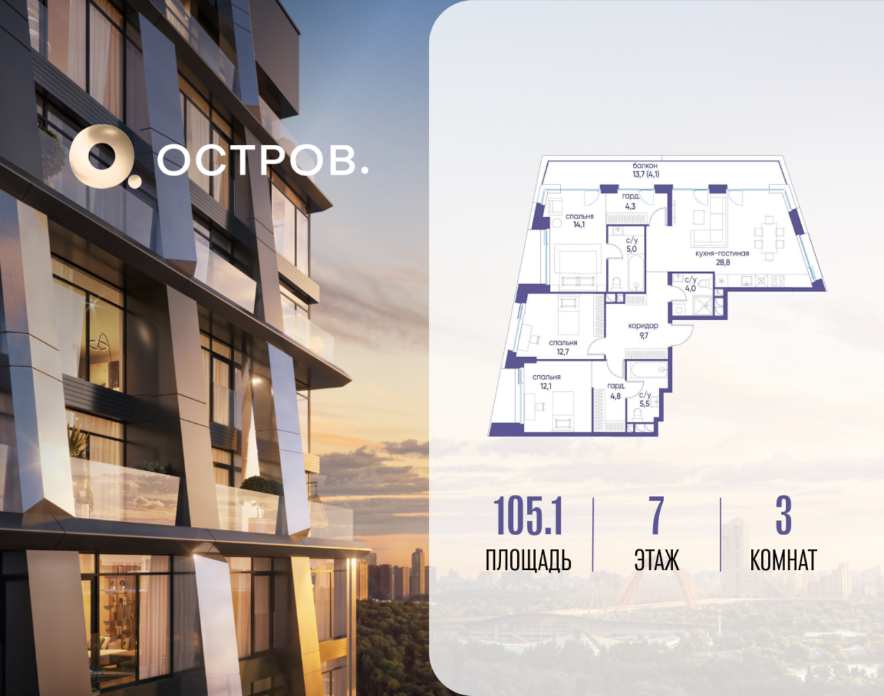 Продаётся трехкомнатная квартира от застройщика: общая площадь 105.12 м², жилая 38.90 м², кухня 28.80 м², 7, жилой квартал «Остров 12», корпус 1 (12.1 квартал) (секция 2). срок сдачи: 4-кв. 2025. , 3 санузла: 3 совмещенных. В жилой зоне 2 больших окна на одну сторону, хорошая инсоляция. Позвоните сейчас и забронируйте квартиру! Купите квартиру для курортной жизни в Москве в квартале ОСТРОВ.12.1. Это единственный на ОСТРОВЕ квартал бизнес-класса, расположенный на первой линии у реки - здесь царит атмосфера ежедневного отпуска. Дома созданы в узнаваемом футуристичном стиле и выглядят как произведения современного искусства. Для жителей предусмотрены фитнес-рум и детский клуб, гостиная и кинотеатр, переговорные и репетиторские комнаты. На крышах устроены видовые общественные пространства с зонами для йоги, коворкингами, лаунжами. Двор-парк располагает всем необходимым для отдыха и общения всех возрастов. ОСТРОВ.12.1 - часть жилого комплекса на западе Москвы, в 15 минутах езды от центра. Это настоящий заповедник посреди большого города, в окружении реки и 650 га заповедников. Здесь все необходимое находится по соседству: от детского сада до супермаркета, от фитнес-зала до серфинг-центра. На территории созданы все условия для отдыха и общения: клубная инфраструктура в домах и дворы-парки, набережные и променады, маршруты для спортсменов, детей и возрастных жителей. В нескольких минутах ходьбы расположена станция метро "Мнёвники" БКЛ. На автомобиле - 10 минут до Москва-Сити и 15 минут до Садового кольца.