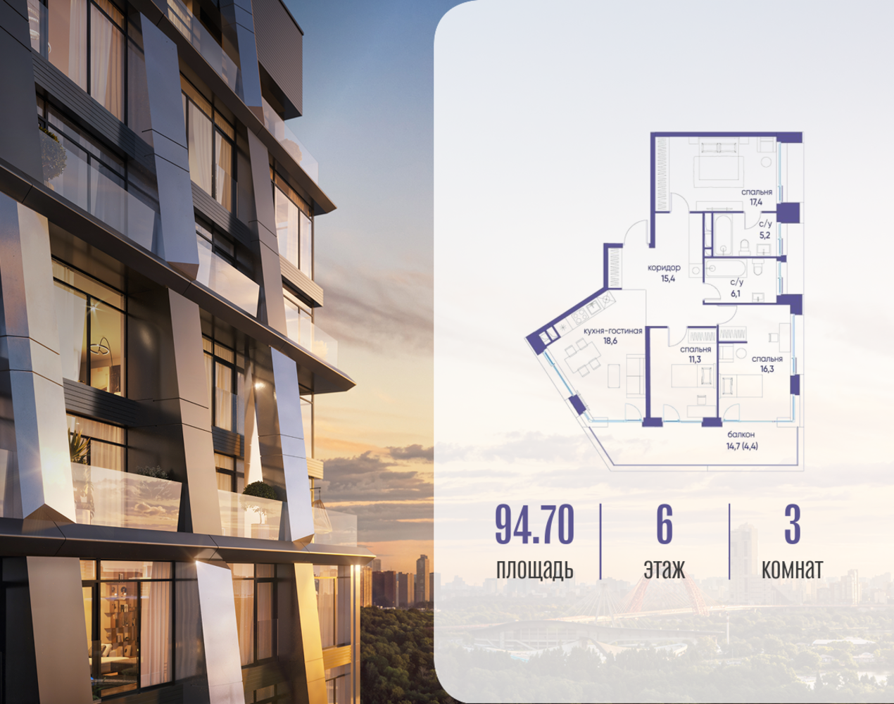 Продаётся трехкомнатная квартира от застройщика: общая площадь 94.72 м², жилая 45.00 м², кухня 18.60 м², 6, жилой квартал «Остров 12», корпус 1 (12.1 квартал) (секция 1). срок сдачи: 4-кв. 2025. , 2 санузла: 2 совмещенных. В жилой зоне 2 больших окна на одну сторону, хорошая инсоляция. Позвоните сейчас и забронируйте квартиру! Купите квартиру для курортной жизни в Москве в квартале ОСТРОВ.12.1. Это единственный на ОСТРОВЕ квартал бизнес-класса, расположенный на первой линии у реки - здесь царит атмосфера ежедневного отпуска. Дома созданы в узнаваемом футуристичном стиле и выглядят как произведения современного искусства. Для жителей предусмотрены фитнес-рум и детский клуб, гостиная и кинотеатр, переговорные и репетиторские комнаты. На крышах устроены видовые общественные пространства с зонами для йоги, коворкингами, лаунжами. Двор-парк располагает всем необходимым для отдыха и общения всех возрастов. ОСТРОВ.12.1 - часть жилого комплекса на западе Москвы, в 15 минутах езды от центра. Это настоящий заповедник посреди большого города, в окружении реки и 650 га заповедников. Здесь все необходимое находится по соседству: от детского сада до супермаркета, от фитнес-зала до серфинг-центра. На территории созданы все условия для отдыха и общения: клубная инфраструктура в домах и дворы-парки, набережные и променады, маршруты для спортсменов, детей и возрастных жителей. В нескольких минутах ходьбы расположена станция метро "Мнёвники" БКЛ. На автомобиле - 10 минут до Москва-Сити и 15 минут до Садового кольца.