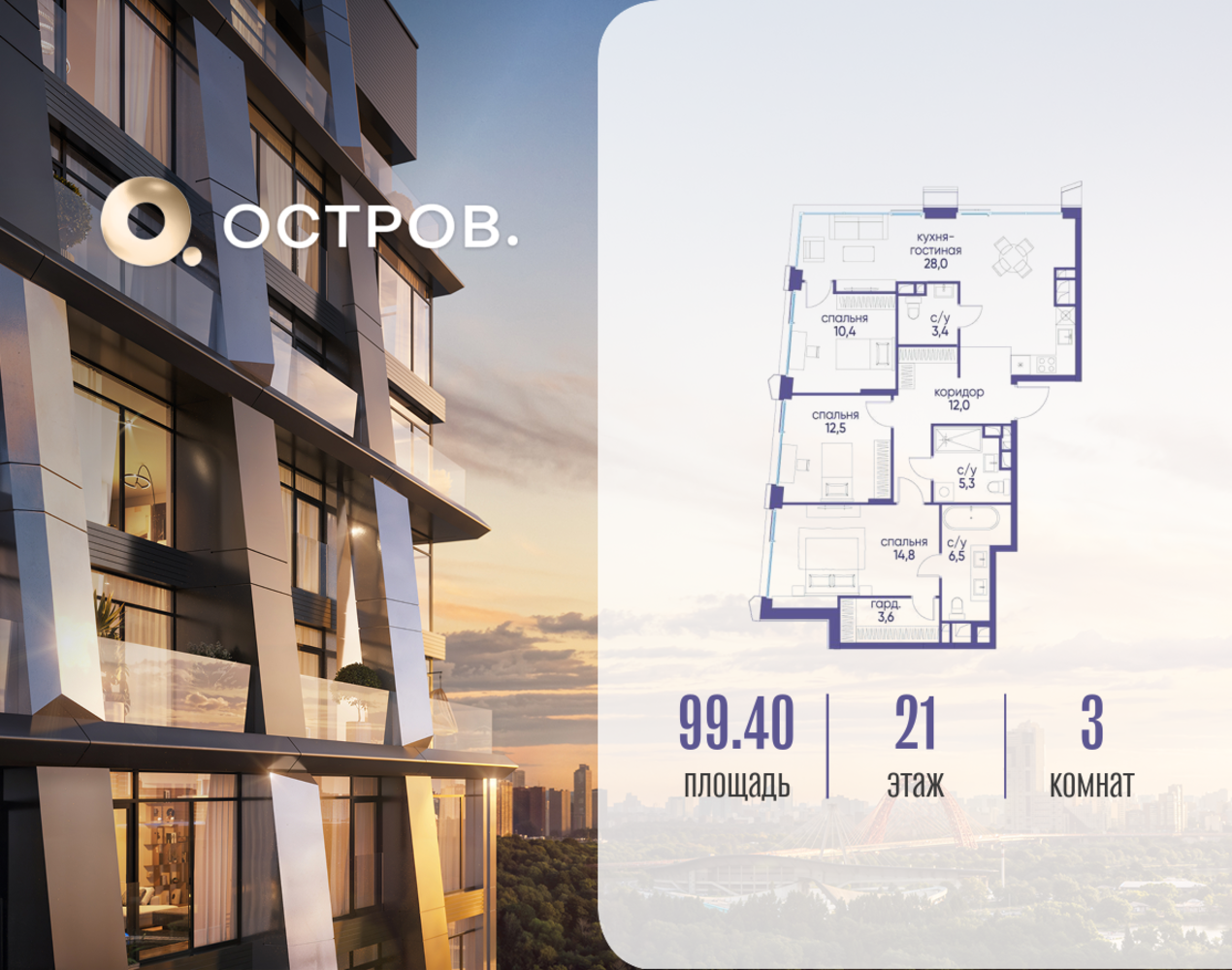 Продаётся трехкомнатная квартира от застройщика: общая площадь 99.42 м², жилая 37.70 м², кухня 28.00 м², 21, жилой квартал «Остров 12», корпус 3 (12.1 квартал) (секция 1). срок сдачи: 4-кв. 2025. , 3 санузла: 1 раздельный и 2 совмещенных. В жилой зоне 2 больших окна на одну сторону, хорошая инсоляция. Позвоните сейчас и забронируйте квартиру! Купите квартиру для курортной жизни в Москве в квартале ОСТРОВ.12.1. Это единственный на ОСТРОВЕ квартал бизнес-класса, расположенный на первой линии у реки - здесь царит атмосфера ежедневного отпуска. Дома созданы в узнаваемом футуристичном стиле и выглядят как произведения современного искусства. Для жителей предусмотрены фитнес-рум и детский клуб, гостиная и кинотеатр, переговорные и репетиторские комнаты. На крышах устроены видовые общественные пространства с зонами для йоги, коворкингами, лаунжами. Двор-парк располагает всем необходимым для отдыха и общения всех возрастов. ОСТРОВ.12.1 - часть жилого комплекса на западе Москвы, в 15 минутах езды от центра. Это настоящий заповедник посреди большого города, в окружении реки и 650 га заповедников. Здесь все необходимое находится по соседству: от детского сада до супермаркета, от фитнес-зала до серфинг-центра. На территории созданы все условия для отдыха и общения: клубная инфраструктура в домах и дворы-парки, набережные и променады, маршруты для спортсменов, детей и возрастных жителей. В нескольких минутах ходьбы расположена станция метро "Мнёвники" БКЛ. На автомобиле - 10 минут до Москва-Сити и 15 минут до Садового кольца.