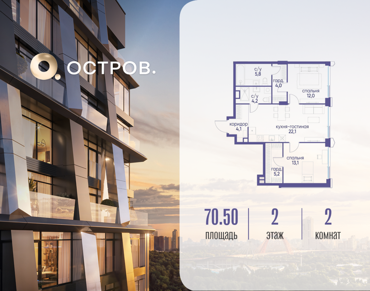 Продаётся двухкомнатная квартира от застройщика: общая площадь 70.52 м², жилая 25.10 м², кухня 22.10 м², 2, жилой квартал «Остров 12», корпус 3 (12.1 квартал) (секция 1). срок сдачи: 4-кв. 2025. , 2 санузла: 2 совмещенных. В жилой зоне 2 больших окна на одну сторону, хорошая инсоляция. Позвоните сейчас и забронируйте квартиру! Купите квартиру для курортной жизни в Москве в квартале ОСТРОВ.12.1. Это единственный на ОСТРОВЕ квартал бизнес-класса, расположенный на первой линии у реки - здесь царит атмосфера ежедневного отпуска. Дома созданы в узнаваемом футуристичном стиле и выглядят как произведения современного искусства. Для жителей предусмотрены фитнес-рум и детский клуб, гостиная и кинотеатр, переговорные и репетиторские комнаты. На крышах устроены видовые общественные пространства с зонами для йоги, коворкингами, лаунжами. Двор-парк располагает всем необходимым для отдыха и общения всех возрастов. ОСТРОВ.12.1 - часть жилого комплекса на западе Москвы, в 15 минутах езды от центра. Это настоящий заповедник посреди большого города, в окружении реки и 650 га заповедников. Здесь все необходимое находится по соседству: от детского сада до супермаркета, от фитнес-зала до серфинг-центра. На территории созданы все условия для отдыха и общения: клубная инфраструктура в домах и дворы-парки, набережные и променады, маршруты для спортсменов, детей и возрастных жителей. В нескольких минутах ходьбы расположена станция метро "Мнёвники" БКЛ. На автомобиле - 10 минут до Москва-Сити и 15 минут до Садового кольца.