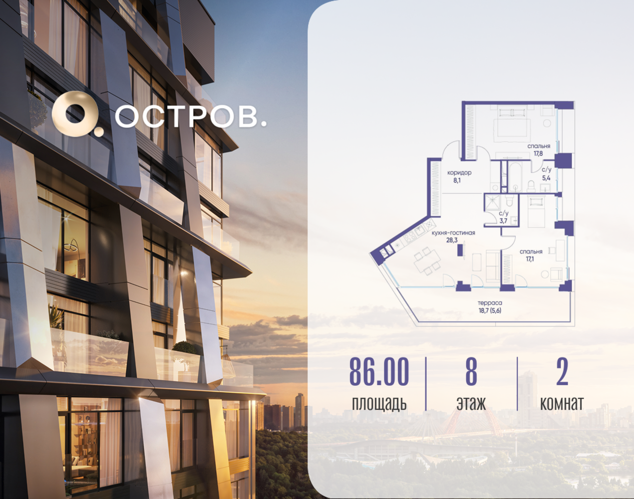 Продаётся двухкомнатная квартира от застройщика: общая площадь 86.02 м², жилая 34.90 м², кухня 28.30 м², 8, жилой квартал «Остров 12», корпус 1 (12.1 квартал) (секция 1). срок сдачи: 4-кв. 2025. , 2 санузла: 2 совмещенных. В жилой зоне 2 больших окна на одну сторону, хорошая инсоляция. Позвоните сейчас и забронируйте квартиру! Купите квартиру для курортной жизни в Москве в квартале ОСТРОВ.12.1. Это единственный на ОСТРОВЕ квартал бизнес-класса, расположенный на первой линии у реки - здесь царит атмосфера ежедневного отпуска. Дома созданы в узнаваемом футуристичном стиле и выглядят как произведения современного искусства. Для жителей предусмотрены фитнес-рум и детский клуб, гостиная и кинотеатр, переговорные и репетиторские комнаты. На крышах устроены видовые общественные пространства с зонами для йоги, коворкингами, лаунжами. Двор-парк располагает всем необходимым для отдыха и общения всех возрастов. ОСТРОВ.12.1 - часть жилого комплекса на западе Москвы, в 15 минутах езды от центра. Это настоящий заповедник посреди большого города, в окружении реки и 650 га заповедников. Здесь все необходимое находится по соседству: от детского сада до супермаркета, от фитнес-зала до серфинг-центра. На территории созданы все условия для отдыха и общения: клубная инфраструктура в домах и дворы-парки, набережные и променады, маршруты для спортсменов, детей и возрастных жителей. В нескольких минутах ходьбы расположена станция метро "Мнёвники" БКЛ. На автомобиле - 10 минут до Москва-Сити и 15 минут до Садового кольца.