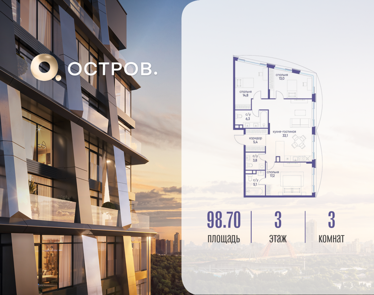 Продаётся 3-комн. квартира от застройщика: общая площадь 98.72 м², жилая 45.00 м², кухня 33.10 м², 3-й этаж, жилой квартал «Остров 12», корпус 4 (секция 1). Срок сдачи: 1 квартал 2029 года. 3 санузла (1 раздельный и 2 совмещенных). В жилой зоне 2 больших окна на одну сторону, хорошая инсоляция. Позвоните сейчас и забронируйте квартиру! ОСТРОВ от Донстрой — жилой комплекс на западе Москвы, в Мневниковской пойме. Уникальное преимущество комплекса — в том, что он обособлен от города рекой и природным парком (650 га). Благодаря природному окружению эта территория имеет лучший экологический рейтинг в столице. Кварталы ОСТРОВА объединены ландшафтным дизайном в единое пространство — с набережными и Центральным бульваром. На ОСТРОВЕ любые объекты, необходимые для полноценной жизни и отдыха, находятся на расстоянии 15-минутной прогулки. Торговый центр и супермаркеты, кафе и рестораны, фитнес, салоны красоты, школы и детские сады. А также крупнейший в Москве спортивный кластер.