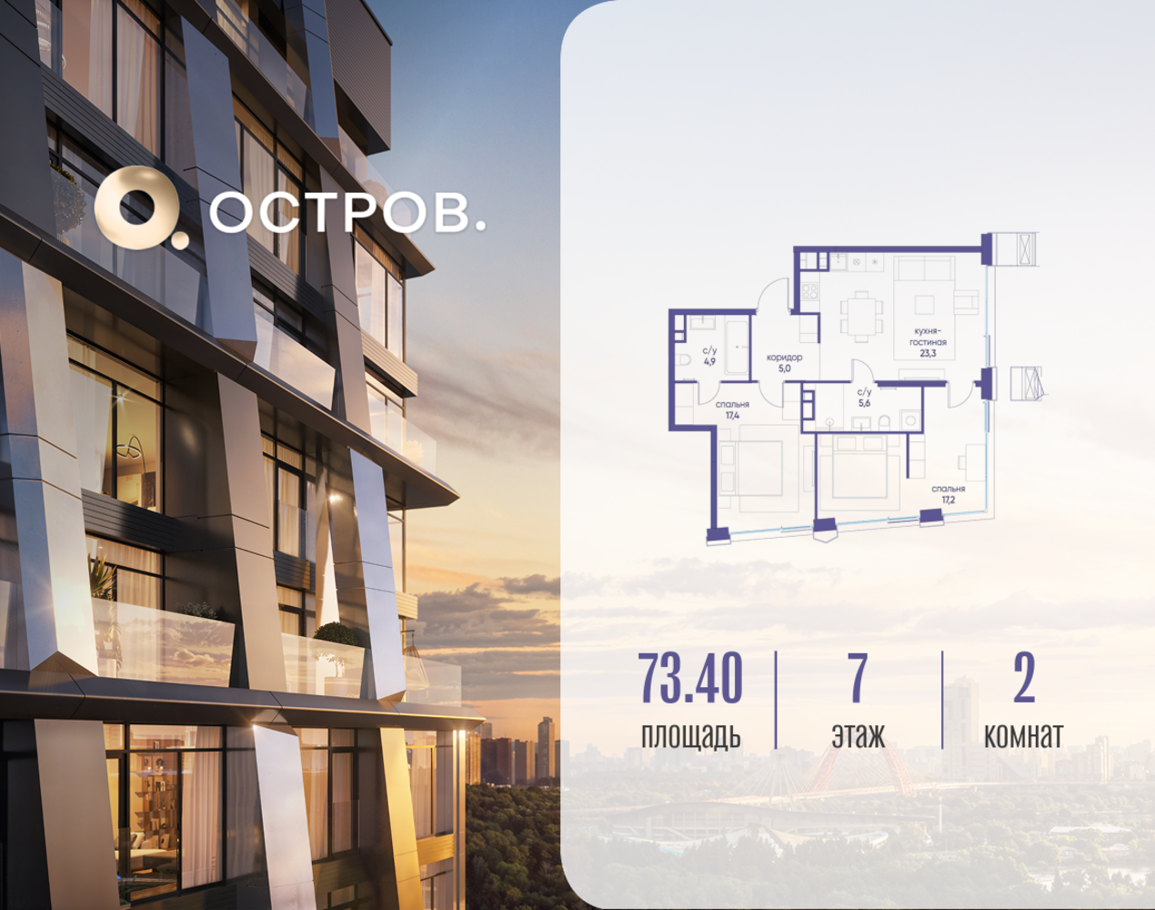 Продаётся 2-комн. квартира от застройщика: общая площадь 73.42 м², жилая 34.60 м², кухня 23.30 м², 7-й этаж, жилой квартал «Остров 12», корпус 2 (секция 1). Срок сдачи: 1 квартал 2029 года. 2 совмещенных санузла. В жилой зоне 2 больших окна на одну сторону, хорошая инсоляция. Позвоните сейчас и забронируйте квартиру! ОСТРОВ от Донстрой — жилой комплекс на западе Москвы, в Мневниковской пойме. Уникальное преимущество комплекса — в том, что он обособлен от города рекой и природным парком (650 га). Благодаря природному окружению эта территория имеет лучший экологический рейтинг в столице. Кварталы ОСТРОВА объединены ландшафтным дизайном в единое пространство — с набережными и Центральным бульваром. На ОСТРОВЕ любые объекты, необходимые для полноценной жизни и отдыха, находятся на расстоянии 15-минутной прогулки. Торговый центр и супермаркеты, кафе и рестораны, фитнес, салоны красоты, школы и детские сады. А также крупнейший в Москве спортивный кластер.