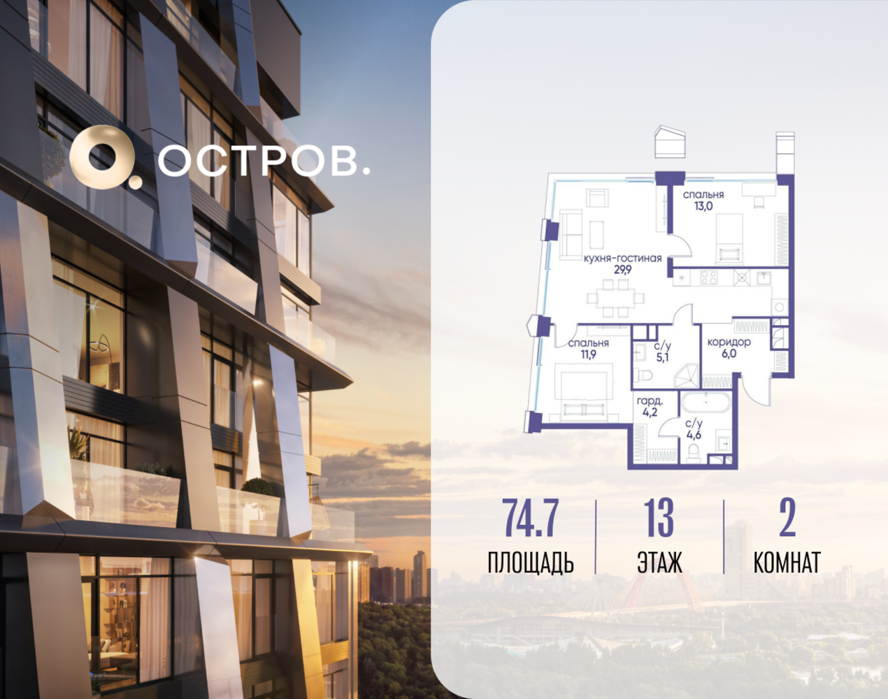 Скидка до 10% действует до 25.12.2025 г. при 100% оплате и не субсидированной ипотеке. Продаётся двухкомнатная квартира от застройщика: общая площадь 74.72 м², жилая 24.90 м², кухня 29.90 м², 13, жилой квартал «Остров 12», корпус 3 (12.1 квартал) (секция 1). срок сдачи: 4-кв. 2025. , 2 санузла: 2 совмещенных. В жилой зоне 2 больших окна на одну сторону, хорошая инсоляция. Позвоните сейчас и забронируйте квартиру! Купите квартиру для курортной жизни в Москве в квартале ОСТРОВ.12.1. Это единственный на ОСТРОВЕ квартал бизнес-класса, расположенный на первой линии у реки - здесь царит атмосфера ежедневного отпуска. Дома созданы в узнаваемом футуристичном стиле и выглядят как произведения современного искусства. Для жителей предусмотрены фитнес-рум и детский клуб, гостиная и кинотеатр, переговорные и репетиторские комнаты. На крышах устроены видовые общественные пространства с зонами для йоги, коворкингами, лаунжами. Двор-парк располагает всем необходимым для отдыха и общения всех возрастов. ОСТРОВ.12.1 - часть жилого комплекса на западе Москвы, в 15 минутах езды от центра. Это настоящий заповедник посреди большого города, в окружении реки и 650 га заповедников. Здесь все необходимое находится по соседству: от детского сада до супермаркета, от фитнес-зала до серфинг-центра. На территории созданы все условия для отдыха и общения: клубная инфраструктура в домах и дворы-парки, набережные и променады, маршруты для спортсменов, детей и возрастных жителей. В нескольких минутах ходьбы расположена станция метро "Мнёвники" БКЛ. На автомобиле - 10 минут до Москва-Сити и 15 минут до Садового кольца.