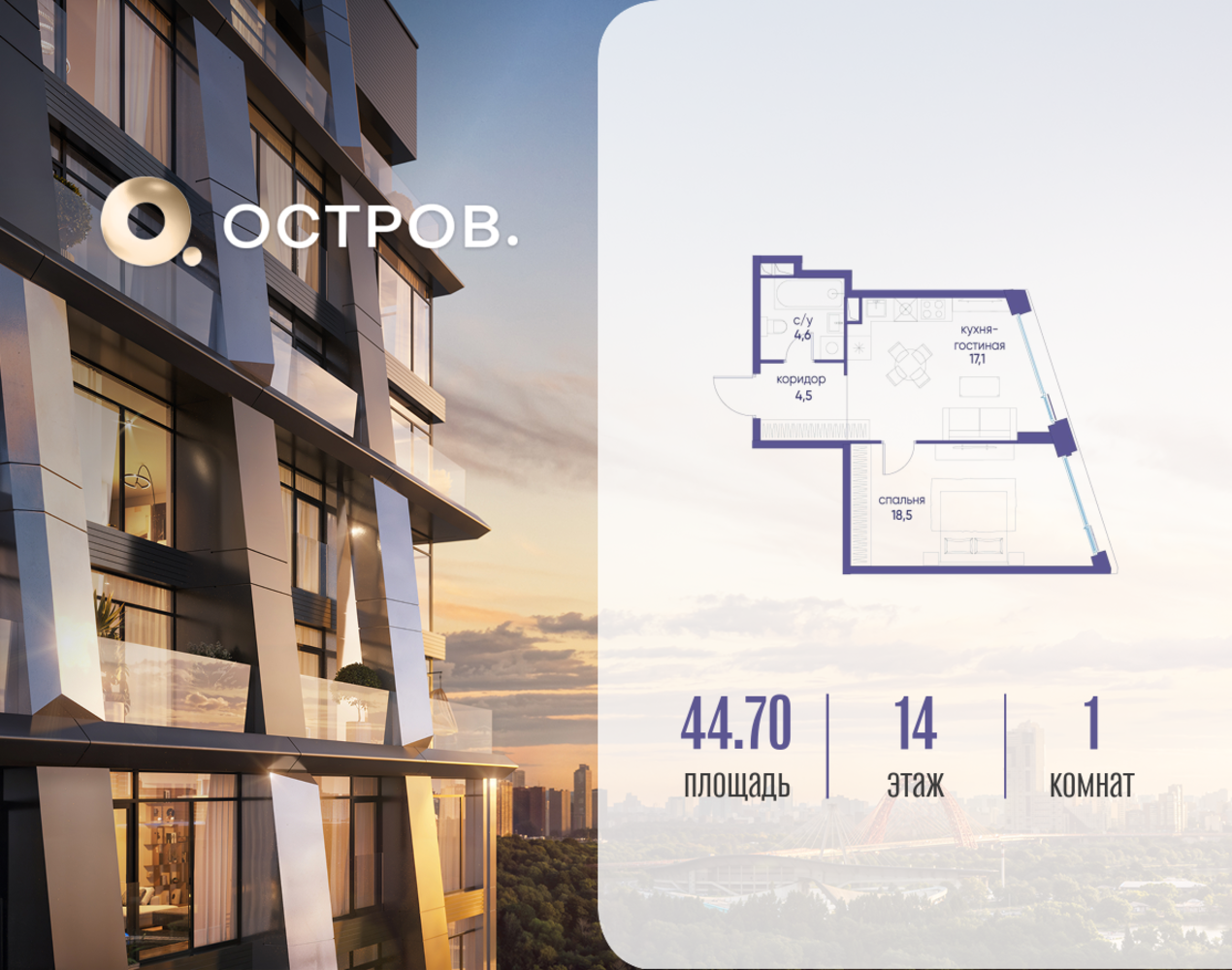 Продаётся однокомнатная квартира от застройщика: общая площадь 44.72 м², жилая 18.50 м², кухня 17.10 м², 14, жилой квартал «Остров 12», корпус 1 (12.1 квартал) (секция 2). срок сдачи: 4-кв. 2025. , 1 совмещенный санузел. В жилой зоне 2 больших окна на одну сторону, хорошая инсоляция. Позвоните сейчас и забронируйте квартиру! Купите квартиру для курортной жизни в Москве в квартале ОСТРОВ.12.1. Это единственный на ОСТРОВЕ квартал бизнес-класса, расположенный на первой линии у реки - здесь царит атмосфера ежедневного отпуска. Дома созданы в узнаваемом футуристичном стиле и выглядят как произведения современного искусства. Для жителей предусмотрены фитнес-рум и детский клуб, гостиная и кинотеатр, переговорные и репетиторские комнаты. На крышах устроены видовые общественные пространства с зонами для йоги, коворкингами, лаунжами. Двор-парк располагает всем необходимым для отдыха и общения всех возрастов. ОСТРОВ.12.1 - часть жилого комплекса на западе Москвы, в 15 минутах езды от центра. Это настоящий заповедник посреди большого города, в окружении реки и 650 га заповедников. Здесь все необходимое находится по соседству: от детского сада до супермаркета, от фитнес-зала до серфинг-центра. На территории созданы все условия для отдыха и общения: клубная инфраструктура в домах и дворы-парки, набережные и променады, маршруты для спортсменов, детей и возрастных жителей. В нескольких минутах ходьбы расположена станция метро "Мнёвники" БКЛ. На автомобиле - 10 минут до Москва-Сити и 15 минут до Садового кольца.