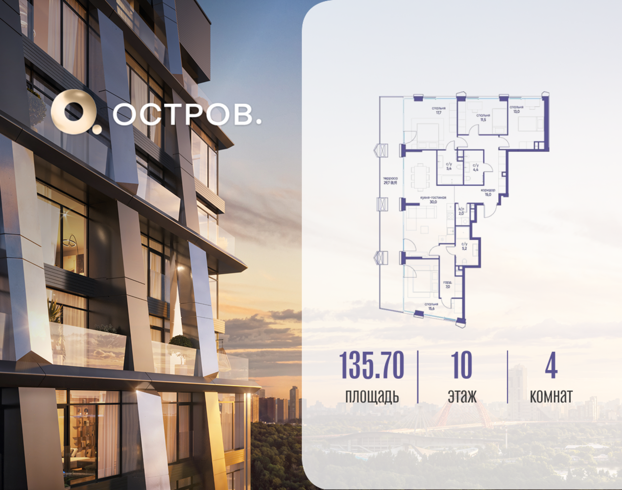 Продаётся 4-комн. квартира от застройщика: общая площадь 135.72 м², жилая 57.80 м², кухня 30.00 м², 10-й этаж, жилой квартал «Остров 12», корпус 2 (секция 1). Срок сдачи: 1 квартал 2029 года. 3 совмещенных санузла. В жилой зоне 2 больших окна на одну сторону, хорошая инсоляция. Позвоните сейчас и забронируйте квартиру! ОСТРОВ от Донстрой — жилой комплекс на западе Москвы, в Мневниковской пойме. Уникальное преимущество комплекса — в том, что он обособлен от города рекой и природным парком (650 га). Благодаря природному окружению эта территория имеет лучший экологический рейтинг в столице. Кварталы ОСТРОВА объединены ландшафтным дизайном в единое пространство — с набережными и Центральным бульваром. На ОСТРОВЕ любые объекты, необходимые для полноценной жизни и отдыха, находятся на расстоянии 15-минутной прогулки. Торговый центр и супермаркеты, кафе и рестораны, фитнес, салоны красоты, школы и детские сады. А также крупнейший в Москве спортивный кластер.