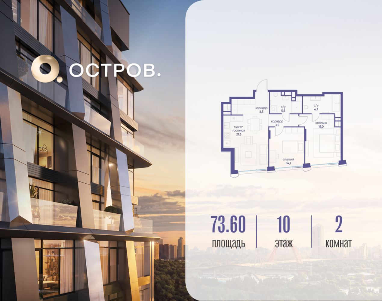 Продаётся 2-комн. квартира от застройщика: общая площадь 73.62 м², жилая 30.10 м², кухня 21.30 м², 10-й этаж, жилой квартал «Остров 12», корпус 2 (секция 1). Срок сдачи: 1 квартал 2029 года. 2 совмещенных санузла. В жилой зоне 2 больших окна на одну сторону, хорошая инсоляция. Позвоните сейчас и забронируйте квартиру! ОСТРОВ от Донстрой — жилой комплекс на западе Москвы, в Мневниковской пойме. Уникальное преимущество комплекса — в том, что он обособлен от города рекой и природным парком (650 га). Благодаря природному окружению эта территория имеет лучший экологический рейтинг в столице. Кварталы ОСТРОВА объединены ландшафтным дизайном в единое пространство — с набережными и Центральным бульваром. На ОСТРОВЕ любые объекты, необходимые для полноценной жизни и отдыха, находятся на расстоянии 15-минутной прогулки. Торговый центр и супермаркеты, кафе и рестораны, фитнес, салоны красоты, школы и детские сады. А также крупнейший в Москве спортивный кластер.