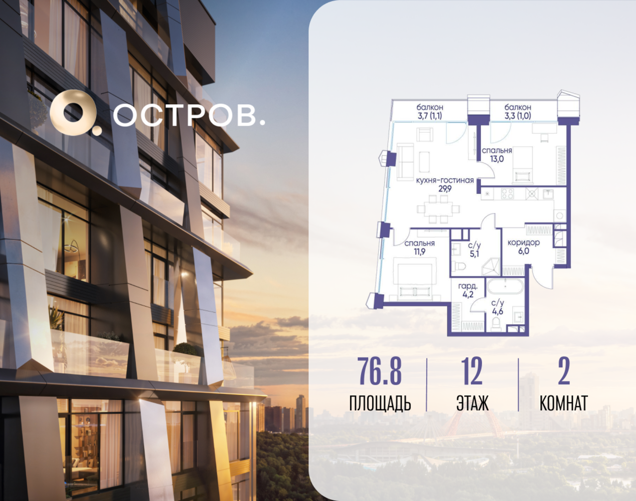 Скидка до 10% действует до 25.12.2025 г. при 100% оплате и не субсидированной ипотеке. Продаётся двухкомнатная квартира от застройщика: общая площадь 76.82 м², жилая 24.90 м², кухня 29.90 м², 12, жилой квартал «Остров 12», корпус 3 (12.1 квартал) (секция 1). срок сдачи: 4-кв. 2025. , 2 санузла: 2 совмещенных. В жилой зоне 2 больших окна на одну сторону, хорошая инсоляция. Позвоните сейчас и забронируйте квартиру! Купите квартиру для курортной жизни в Москве в квартале ОСТРОВ.12.1. Это единственный на ОСТРОВЕ квартал бизнес-класса, расположенный на первой линии у реки - здесь царит атмосфера ежедневного отпуска. Дома созданы в узнаваемом футуристичном стиле и выглядят как произведения современного искусства. Для жителей предусмотрены фитнес-рум и детский клуб, гостиная и кинотеатр, переговорные и репетиторские комнаты. На крышах устроены видовые общественные пространства с зонами для йоги, коворкингами, лаунжами. Двор-парк располагает всем необходимым для отдыха и общения всех возрастов. ОСТРОВ.12.1 - часть жилого комплекса на западе Москвы, в 15 минутах езды от центра. Это настоящий заповедник посреди большого города, в окружении реки и 650 га заповедников. Здесь все необходимое находится по соседству: от детского сада до супермаркета, от фитнес-зала до серфинг-центра. На территории созданы все условия для отдыха и общения: клубная инфраструктура в домах и дворы-парки, набережные и променады, маршруты для спортсменов, детей и возрастных жителей. В нескольких минутах ходьбы расположена станция метро "Мнёвники" БКЛ. На автомобиле - 10 минут до Москва-Сити и 15 минут до Садового кольца.