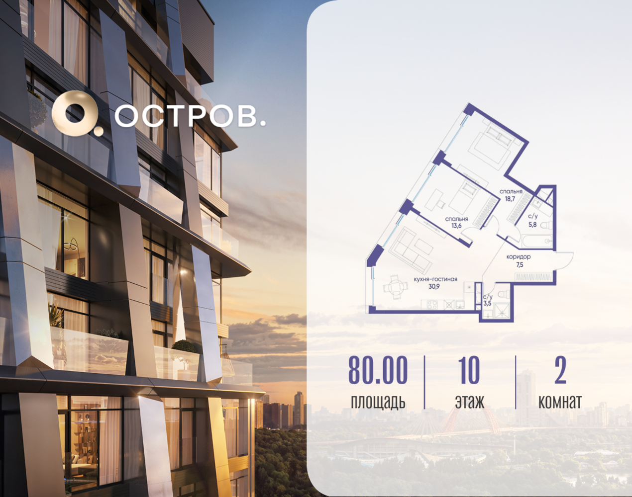 Продаётся двухкомнатная квартира от застройщика: общая площадь 80.02 м², жилая 32.30 м², кухня 30.90 м², 10, жилой квартал «Остров 12», корпус 1 (12.1 квартал) (секция 1). срок сдачи: 4-кв. 2025. , 2 санузла: 2 совмещенных. В жилой зоне 2 больших окна на одну сторону, хорошая инсоляция. Позвоните сейчас и забронируйте квартиру! Купите квартиру для курортной жизни в Москве в квартале ОСТРОВ.12.1. Это единственный на ОСТРОВЕ квартал бизнес-класса, расположенный на первой линии у реки - здесь царит атмосфера ежедневного отпуска. Дома созданы в узнаваемом футуристичном стиле и выглядят как произведения современного искусства. Для жителей предусмотрены фитнес-рум и детский клуб, гостиная и кинотеатр, переговорные и репетиторские комнаты. На крышах устроены видовые общественные пространства с зонами для йоги, коворкингами, лаунжами. Двор-парк располагает всем необходимым для отдыха и общения всех возрастов. ОСТРОВ.12.1 - часть жилого комплекса на западе Москвы, в 15 минутах езды от центра. Это настоящий заповедник посреди большого города, в окружении реки и 650 га заповедников. Здесь все необходимое находится по соседству: от детского сада до супермаркета, от фитнес-зала до серфинг-центра. На территории созданы все условия для отдыха и общения: клубная инфраструктура в домах и дворы-парки, набережные и променады, маршруты для спортсменов, детей и возрастных жителей. В нескольких минутах ходьбы расположена станция метро "Мнёвники" БКЛ. На автомобиле - 10 минут до Москва-Сити и 15 минут до Садового кольца.