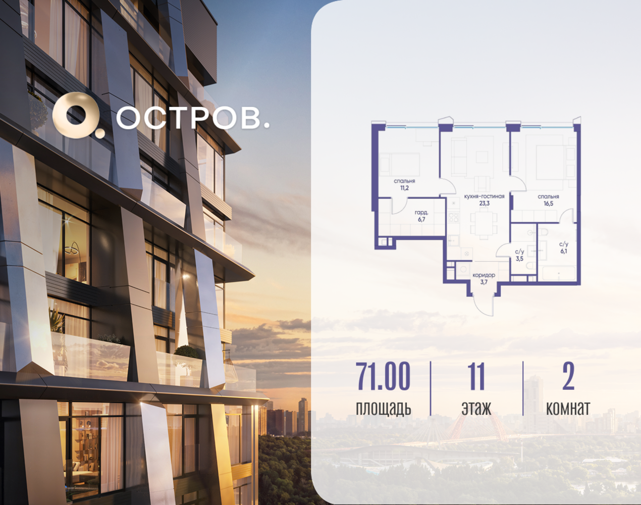 Продаётся 2-комн. квартира от застройщика: общая площадь 71.02 м², жилая 27.70 м², кухня 23.30 м², 11-й этаж, жилой квартал «Остров 12», корпус 2 (секция 1). Срок сдачи: 1 квартал 2029 года. 2 совмещенных санузла. В жилой зоне 2 больших окна на одну сторону, хорошая инсоляция. Позвоните сейчас и забронируйте квартиру! ОСТРОВ от Донстрой — жилой комплекс на западе Москвы, в Мневниковской пойме. Уникальное преимущество комплекса — в том, что он обособлен от города рекой и природным парком (650 га). Благодаря природному окружению эта территория имеет лучший экологический рейтинг в столице. Кварталы ОСТРОВА объединены ландшафтным дизайном в единое пространство — с набережными и Центральным бульваром. На ОСТРОВЕ любые объекты, необходимые для полноценной жизни и отдыха, находятся на расстоянии 15-минутной прогулки. Торговый центр и супермаркеты, кафе и рестораны, фитнес, салоны красоты, школы и детские сады. А также крупнейший в Москве спортивный кластер.