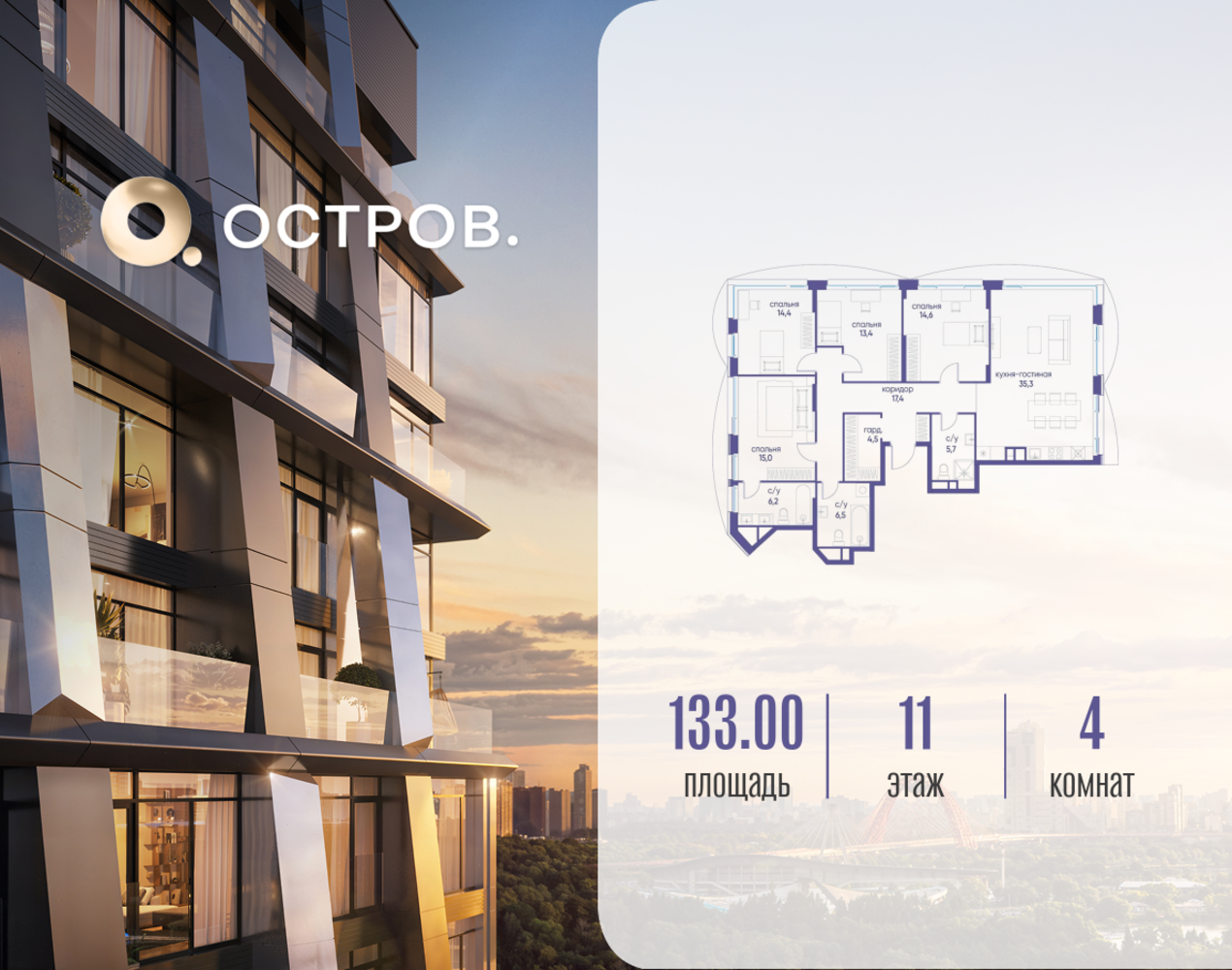 Продаётся 4-комн. квартира от застройщика: общая площадь 133.02 м², жилая 57.40 м², кухня 35.30 м², 11-й этаж, жилой квартал «Остров 12», корпус 4 (секция 1). Срок сдачи: 1 квартал 2029 года. 3 совмещенных санузла. В жилой зоне 2 больших окна на одну сторону, хорошая инсоляция. Позвоните сейчас и забронируйте квартиру! ОСТРОВ от Донстрой — жилой комплекс на западе Москвы, в Мневниковской пойме. Уникальное преимущество комплекса — в том, что он обособлен от города рекой и природным парком (650 га). Благодаря природному окружению эта территория имеет лучший экологический рейтинг в столице. Кварталы ОСТРОВА объединены ландшафтным дизайном в единое пространство — с набережными и Центральным бульваром. На ОСТРОВЕ любые объекты, необходимые для полноценной жизни и отдыха, находятся на расстоянии 15-минутной прогулки. Торговый центр и супермаркеты, кафе и рестораны, фитнес, салоны красоты, школы и детские сады. А также крупнейший в Москве спортивный кластер.