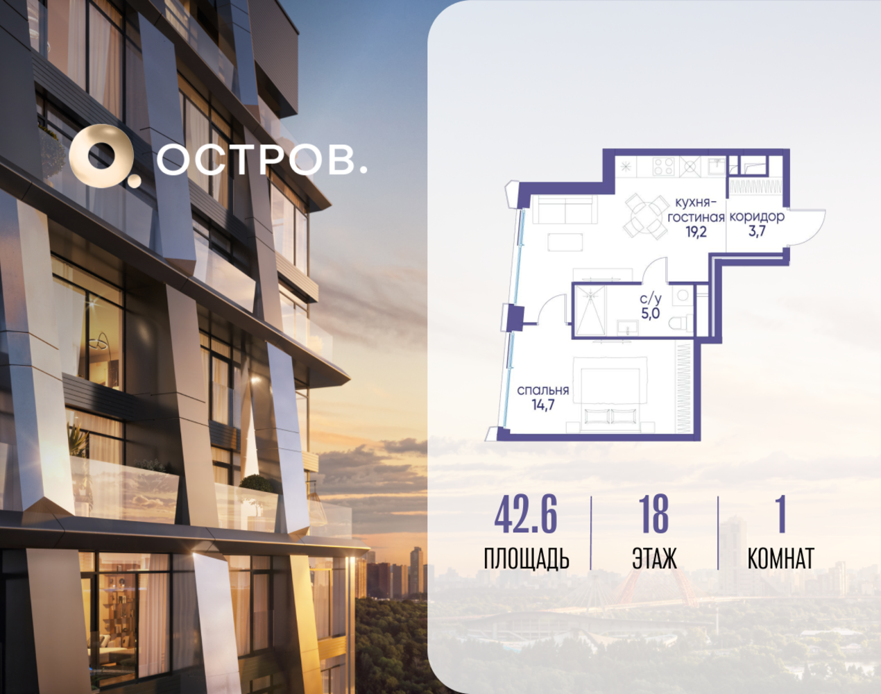 Продаётся однокомнатная квартира от застройщика: общая площадь 42.62 м², жилая 14.70 м², кухня 19.20 м², 18, жилой квартал «Остров 12», корпус 3 (12.1 квартал) (секция 1). срок сдачи: 4-кв. 2025. , 1 совмещенный санузел. В жилой зоне 2 больших окна на одну сторону, хорошая инсоляция. Позвоните сейчас и забронируйте квартиру! Купите квартиру для курортной жизни в Москве в квартале ОСТРОВ.12.1. Это единственный на ОСТРОВЕ квартал бизнес-класса, расположенный на первой линии у реки - здесь царит атмосфера ежедневного отпуска. Дома созданы в узнаваемом футуристичном стиле и выглядят как произведения современного искусства. Для жителей предусмотрены фитнес-рум и детский клуб, гостиная и кинотеатр, переговорные и репетиторские комнаты. На крышах устроены видовые общественные пространства с зонами для йоги, коворкингами, лаунжами. Двор-парк располагает всем необходимым для отдыха и общения всех возрастов. ОСТРОВ.12.1 - часть жилого комплекса на западе Москвы, в 15 минутах езды от центра. Это настоящий заповедник посреди большого города, в окружении реки и 650 га заповедников. Здесь все необходимое находится по соседству: от детского сада до супермаркета, от фитнес-зала до серфинг-центра. На территории созданы все условия для отдыха и общения: клубная инфраструктура в домах и дворы-парки, набережные и променады, маршруты для спортсменов, детей и возрастных жителей. В нескольких минутах ходьбы расположена станция метро "Мнёвники" БКЛ. На автомобиле - 10 минут до Москва-Сити и 15 минут до Садового кольца.