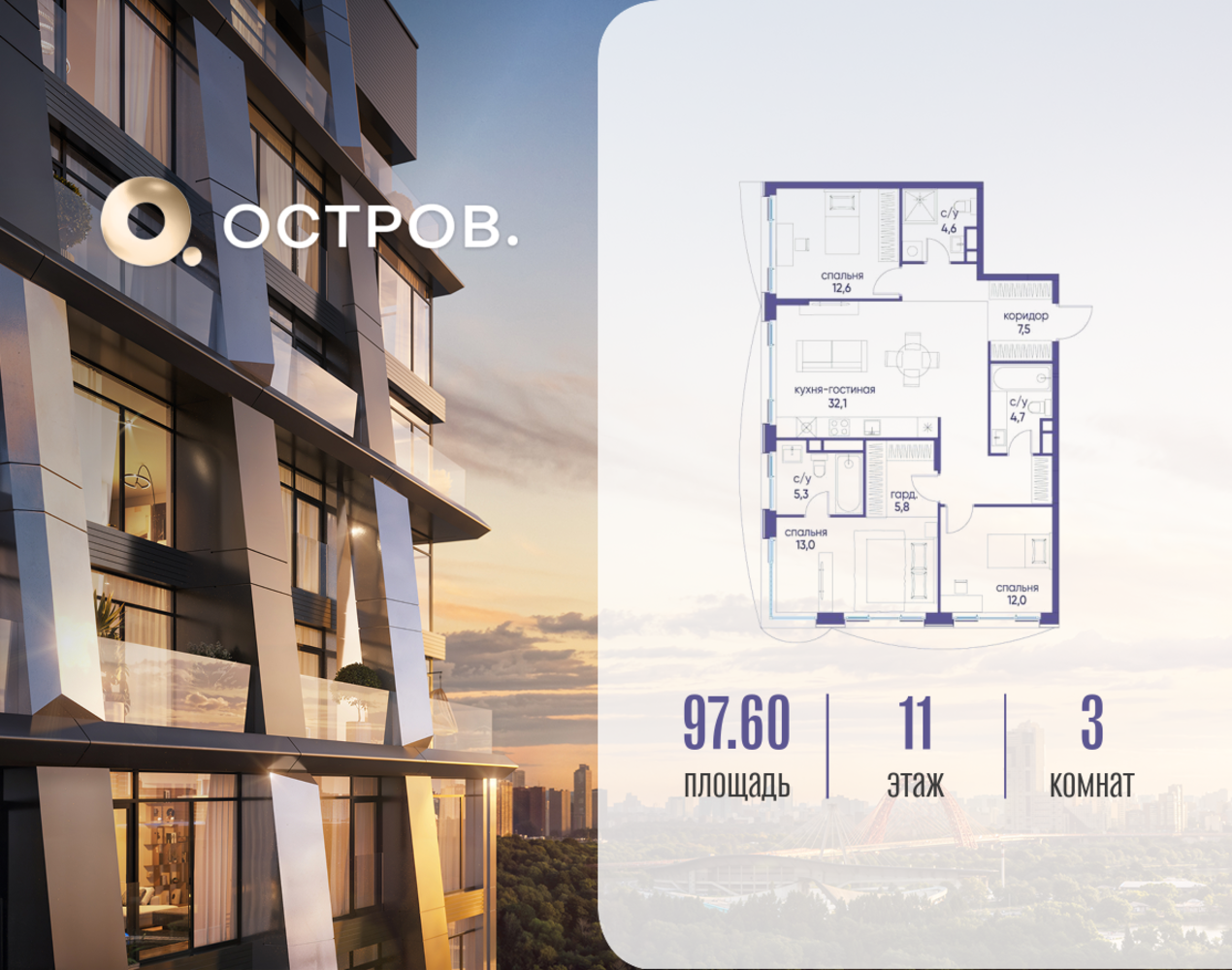 Продаётся 3-комн. квартира от застройщика: общая площадь 97.62 м², жилая 37.60 м², кухня 32.10 м², 11-й этаж, жилой квартал «Остров 12», корпус 4 (секция 1). Срок сдачи: 1 квартал 2029 года. 3 совмещенных санузла. В жилой зоне 2 больших окна на одну сторону, хорошая инсоляция. Позвоните сейчас и забронируйте квартиру! ОСТРОВ от Донстрой — жилой комплекс на западе Москвы, в Мневниковской пойме. Уникальное преимущество комплекса — в том, что он обособлен от города рекой и природным парком (650 га). Благодаря природному окружению эта территория имеет лучший экологический рейтинг в столице. Кварталы ОСТРОВА объединены ландшафтным дизайном в единое пространство — с набережными и Центральным бульваром. На ОСТРОВЕ любые объекты, необходимые для полноценной жизни и отдыха, находятся на расстоянии 15-минутной прогулки. Торговый центр и супермаркеты, кафе и рестораны, фитнес, салоны красоты, школы и детские сады. А также крупнейший в Москве спортивный кластер.
