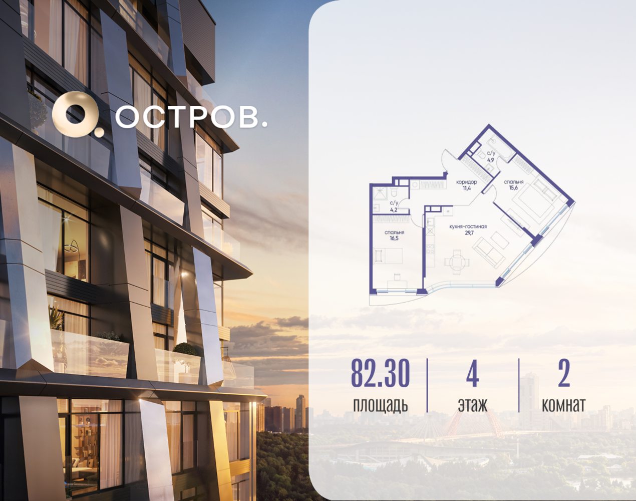 Продаётся 2-комн. квартира от застройщика: общая площадь 82.32 м², жилая 32.10 м², кухня 29.70 м², 4-й этаж, жилой квартал «Остров 12», корпус 4 (секция 1). Срок сдачи: 1 квартал 2029 года. 2 совмещенных санузла. В жилой зоне 2 больших окна на одну сторону, хорошая инсоляция. Позвоните сейчас и забронируйте квартиру! ОСТРОВ от Донстрой — жилой комплекс на западе Москвы, в Мневниковской пойме. Уникальное преимущество комплекса — в том, что он обособлен от города рекой и природным парком (650 га). Благодаря природному окружению эта территория имеет лучший экологический рейтинг в столице. Кварталы ОСТРОВА объединены ландшафтным дизайном в единое пространство — с набережными и Центральным бульваром. На ОСТРОВЕ любые объекты, необходимые для полноценной жизни и отдыха, находятся на расстоянии 15-минутной прогулки. Торговый центр и супермаркеты, кафе и рестораны, фитнес, салоны красоты, школы и детские сады. А также крупнейший в Москве спортивный кластер.