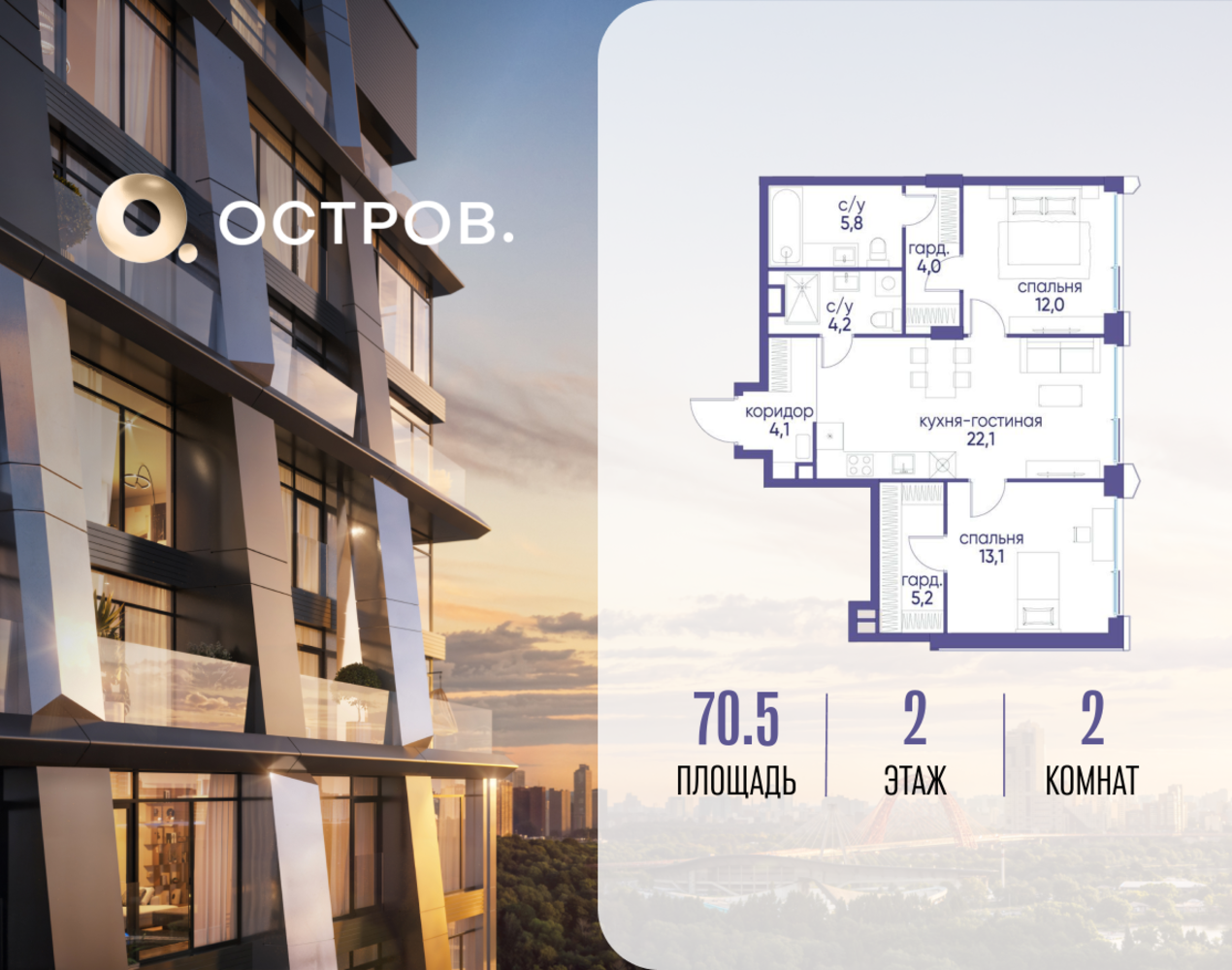 Продаётся двухкомнатная квартира от застройщика: общая площадь 70.52 м², жилая 25.10 м², кухня 22.10 м², 2, жилой квартал «Остров 12», корпус 3 (12.1 квартал) (секция 1). срок сдачи: 4-кв. 2025. , 2 санузла: 2 совмещенных. В жилой зоне 2 больших окна на одну сторону, хорошая инсоляция. Позвоните сейчас и забронируйте квартиру! Купите квартиру для курортной жизни в Москве в квартале ОСТРОВ.12.1. Это единственный на ОСТРОВЕ квартал бизнес-класса, расположенный на первой линии у реки - здесь царит атмосфера ежедневного отпуска. Дома созданы в узнаваемом футуристичном стиле и выглядят как произведения современного искусства. Для жителей предусмотрены фитнес-рум и детский клуб, гостиная и кинотеатр, переговорные и репетиторские комнаты. На крышах устроены видовые общественные пространства с зонами для йоги, коворкингами, лаунжами. Двор-парк располагает всем необходимым для отдыха и общения всех возрастов. ОСТРОВ.12.1 - часть жилого комплекса на западе Москвы, в 15 минутах езды от центра. Это настоящий заповедник посреди большого города, в окружении реки и 650 га заповедников. Здесь все необходимое находится по соседству: от детского сада до супермаркета, от фитнес-зала до серфинг-центра. На территории созданы все условия для отдыха и общения: клубная инфраструктура в домах и дворы-парки, набережные и променады, маршруты для спортсменов, детей и возрастных жителей. В нескольких минутах ходьбы расположена станция метро "Мнёвники" БКЛ. На автомобиле - 10 минут до Москва-Сити и 15 минут до Садового кольца.