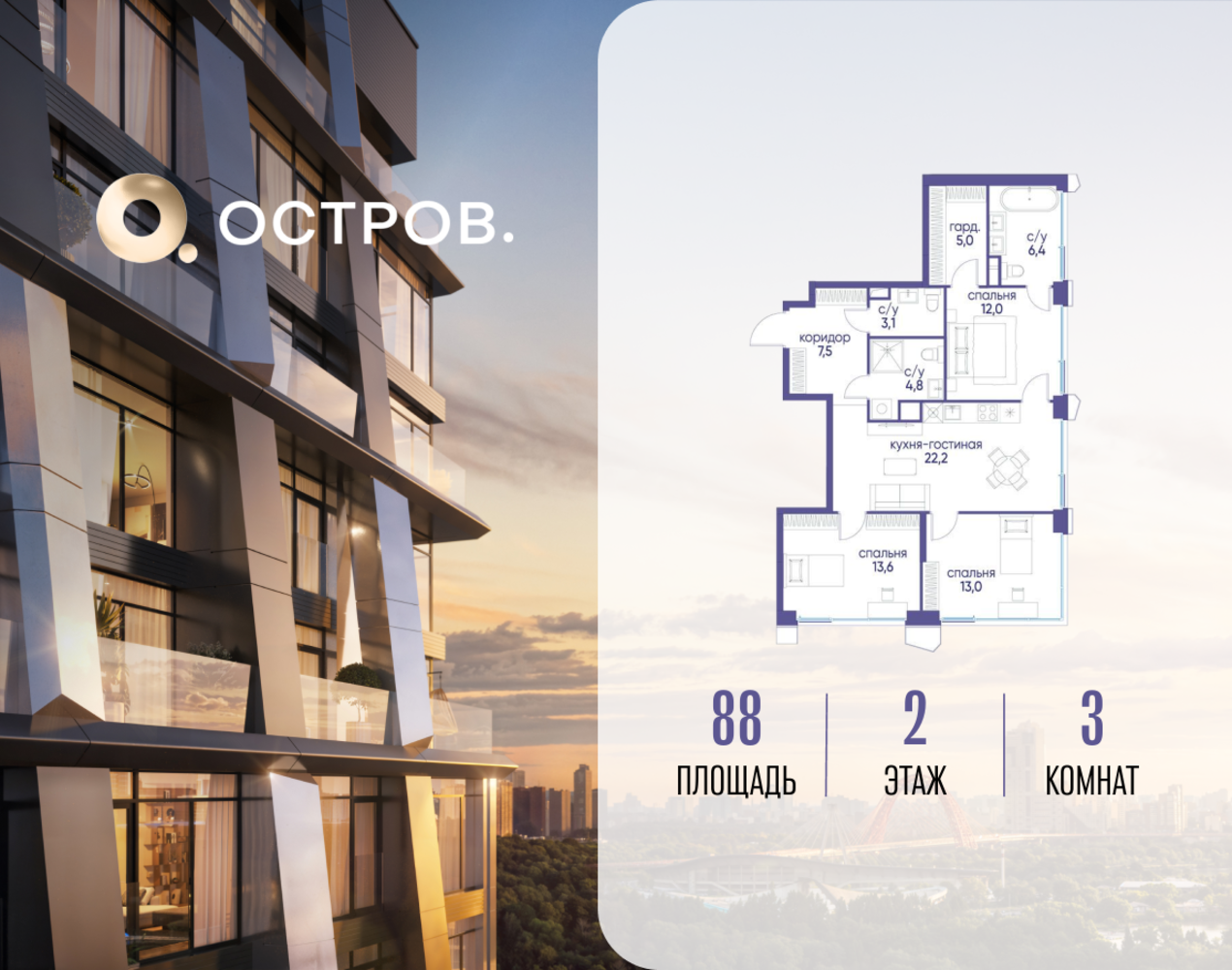 Продаётся трехкомнатная квартира от застройщика: общая площадь 88.02 м², жилая 38.60 м², кухня 22.20 м², 2, жилой квартал «Остров 12», корпус 3 (12.1 квартал) (секция 1). срок сдачи: 4-кв. 2025. , 3 санузла: 1 раздельный и 2 совмещенных. В жилой зоне 2 больших окна на одну сторону, хорошая инсоляция. Позвоните сейчас и забронируйте квартиру! Купите квартиру для курортной жизни в Москве в квартале ОСТРОВ.12.1. Это единственный на ОСТРОВЕ квартал бизнес-класса, расположенный на первой линии у реки - здесь царит атмосфера ежедневного отпуска. Дома созданы в узнаваемом футуристичном стиле и выглядят как произведения современного искусства. Для жителей предусмотрены фитнес-рум и детский клуб, гостиная и кинотеатр, переговорные и репетиторские комнаты. На крышах устроены видовые общественные пространства с зонами для йоги, коворкингами, лаунжами. Двор-парк располагает всем необходимым для отдыха и общения всех возрастов. ОСТРОВ.12.1 - часть жилого комплекса на западе Москвы, в 15 минутах езды от центра. Это настоящий заповедник посреди большого города, в окружении реки и 650 га заповедников. Здесь все необходимое находится по соседству: от детского сада до супермаркета, от фитнес-зала до серфинг-центра. На территории созданы все условия для отдыха и общения: клубная инфраструктура в домах и дворы-парки, набережные и променады, маршруты для спортсменов, детей и возрастных жителей. В нескольких минутах ходьбы расположена станция метро "Мнёвники" БКЛ. На автомобиле - 10 минут до Москва-Сити и 15 минут до Садового кольца.