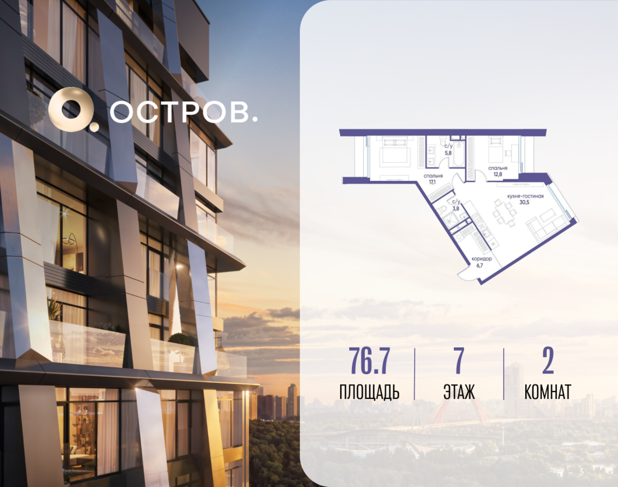 Продаётся двухкомнатная квартира от застройщика: общая площадь 76.72 м², жилая 29.90 м², кухня 30.50 м², 7, жилой квартал «Остров 12», корпус 1 (12.1 квартал) (секция 1). срок сдачи: 4-кв. 2025. , 2 санузла: 2 совмещенных. В жилой зоне 2 больших окна на одну сторону, хорошая инсоляция. Позвоните сейчас и забронируйте квартиру! Купите квартиру для курортной жизни в Москве в квартале ОСТРОВ.12.1. Это единственный на ОСТРОВЕ квартал бизнес-класса, расположенный на первой линии у реки - здесь царит атмосфера ежедневного отпуска. Дома созданы в узнаваемом футуристичном стиле и выглядят как произведения современного искусства. Для жителей предусмотрены фитнес-рум и детский клуб, гостиная и кинотеатр, переговорные и репетиторские комнаты. На крышах устроены видовые общественные пространства с зонами для йоги, коворкингами, лаунжами. Двор-парк располагает всем необходимым для отдыха и общения всех возрастов. ОСТРОВ.12.1 - часть жилого комплекса на западе Москвы, в 15 минутах езды от центра. Это настоящий заповедник посреди большого города, в окружении реки и 650 га заповедников. Здесь все необходимое находится по соседству: от детского сада до супермаркета, от фитнес-зала до серфинг-центра. На территории созданы все условия для отдыха и общения: клубная инфраструктура в домах и дворы-парки, набережные и променады, маршруты для спортсменов, детей и возрастных жителей. В нескольких минутах ходьбы расположена станция метро "Мнёвники" БКЛ. На автомобиле - 10 минут до Москва-Сити и 15 минут до Садового кольца.