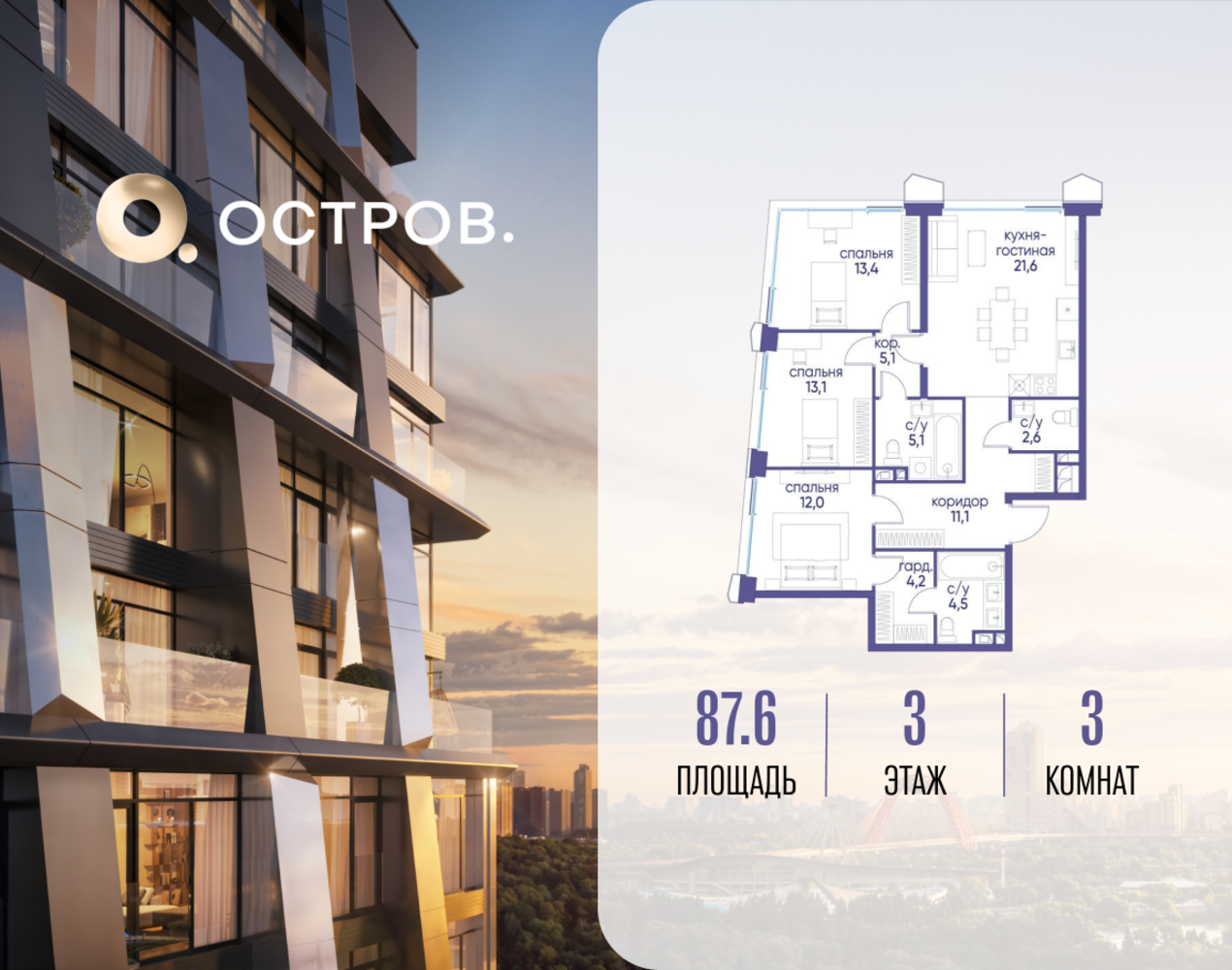 Продаётся трехкомнатная квартира от застройщика: общая площадь 87.62 м², жилая 38.50 м², кухня 21.60 м², 3, жилой квартал «Остров 12», корпус 3 (12.1 квартал) (секция 1). срок сдачи: 4-кв. 2025. , 3 санузла: 1 раздельный и 2 совмещенных. В жилой зоне 2 больших окна на одну сторону, хорошая инсоляция. Позвоните сейчас и забронируйте квартиру! Купите квартиру для курортной жизни в Москве в квартале ОСТРОВ.12.1. Это единственный на ОСТРОВЕ квартал бизнес-класса, расположенный на первой линии у реки - здесь царит атмосфера ежедневного отпуска. Дома созданы в узнаваемом футуристичном стиле и выглядят как произведения современного искусства. Для жителей предусмотрены фитнес-рум и детский клуб, гостиная и кинотеатр, переговорные и репетиторские комнаты. На крышах устроены видовые общественные пространства с зонами для йоги, коворкингами, лаунжами. Двор-парк располагает всем необходимым для отдыха и общения всех возрастов. ОСТРОВ.12.1 - часть жилого комплекса на западе Москвы, в 15 минутах езды от центра. Это настоящий заповедник посреди большого города, в окружении реки и 650 га заповедников. Здесь все необходимое находится по соседству: от детского сада до супермаркета, от фитнес-зала до серфинг-центра. На территории созданы все условия для отдыха и общения: клубная инфраструктура в домах и дворы-парки, набережные и променады, маршруты для спортсменов, детей и возрастных жителей. В нескольких минутах ходьбы расположена станция метро "Мнёвники" БКЛ. На автомобиле - 10 минут до Москва-Сити и 15 минут до Садового кольца.