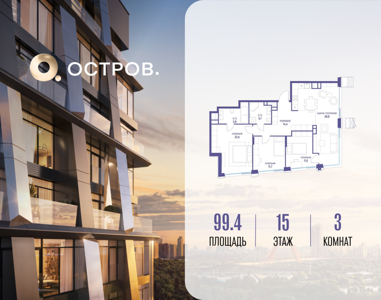 Продаётся 3-комн. квартира от застройщика: общая площадь 99.42 м², жилая 45.30 м², кухня 28.80 м², 15-й этаж, жилой квартал «Остров 12», корпус 2 (секция 1). Срок сдачи: 1 квартал 2029 года. 2 совмещенных санузла. В жилой зоне 2 больших окна на одну сторону, хорошая инсоляция. Позвоните сейчас и забронируйте квартиру! ОСТРОВ от Донстрой — жилой комплекс на западе Москвы, в Мневниковской пойме. Уникальное преимущество комплекса — в том, что он обособлен от города рекой и природным парком (650 га). Благодаря природному окружению эта территория имеет лучший экологический рейтинг в столице. Кварталы ОСТРОВА объединены ландшафтным дизайном в единое пространство — с набережными и Центральным бульваром. На ОСТРОВЕ любые объекты, необходимые для полноценной жизни и отдыха, находятся на расстоянии 15-минутной прогулки. Торговый центр и супермаркеты, кафе и рестораны, фитнес, салоны красоты, школы и детские сады. А также крупнейший в Москве спортивный кластер.