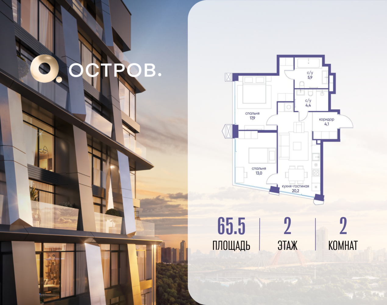 Продаётся 2-комн. квартира от застройщика: общая площадь 65.52 м², жилая 30.90 м², кухня 20.20 м², 2-й этаж, жилой квартал «Остров 12», корпус 2 (секция 1). Срок сдачи: 1 квартал 2029 года. 2 совмещенных санузла. В жилой зоне 2 больших окна на одну сторону, хорошая инсоляция. Позвоните сейчас и забронируйте квартиру! ОСТРОВ от Донстрой — жилой комплекс на западе Москвы, в Мневниковской пойме. Уникальное преимущество комплекса — в том, что он обособлен от города рекой и природным парком (650 га). Благодаря природному окружению эта территория имеет лучший экологический рейтинг в столице. Кварталы ОСТРОВА объединены ландшафтным дизайном в единое пространство — с набережными и Центральным бульваром. На ОСТРОВЕ любые объекты, необходимые для полноценной жизни и отдыха, находятся на расстоянии 15-минутной прогулки. Торговый центр и супермаркеты, кафе и рестораны, фитнес, салоны красоты, школы и детские сады. А также крупнейший в Москве спортивный кластер.