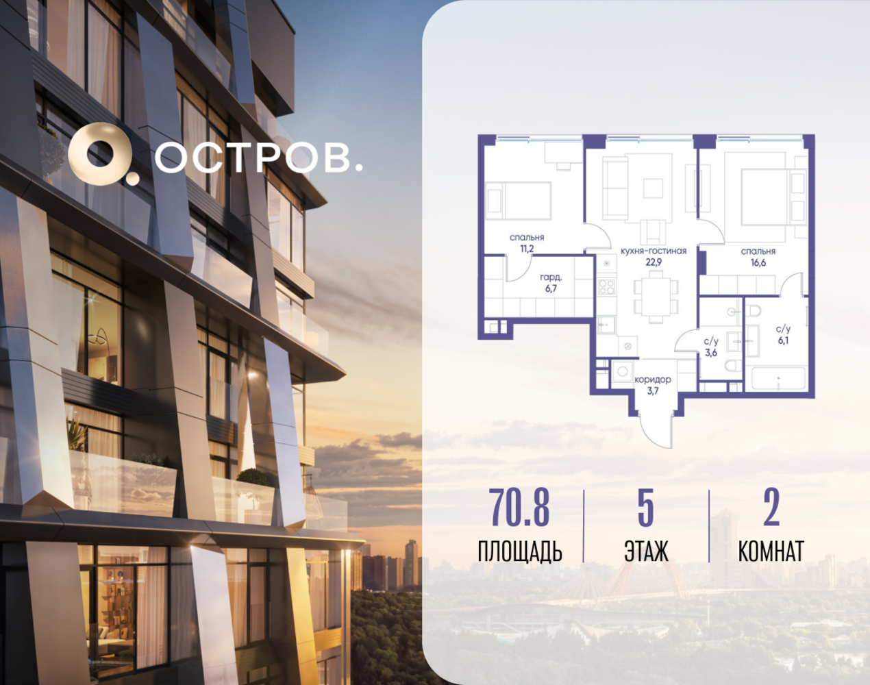 Продаётся 2-комн. квартира от застройщика: общая площадь 70.82 м², жилая 27.80 м², кухня 22.90 м², 5-й этаж, жилой квартал «Остров 12», корпус 2 (секция 1). Срок сдачи: 1 квартал 2029 года. 2 совмещенных санузла. В жилой зоне 2 больших окна на одну сторону, хорошая инсоляция. Позвоните сейчас и забронируйте квартиру! ОСТРОВ от Донстрой — жилой комплекс на западе Москвы, в Мневниковской пойме. Уникальное преимущество комплекса — в том, что он обособлен от города рекой и природным парком (650 га). Благодаря природному окружению эта территория имеет лучший экологический рейтинг в столице. Кварталы ОСТРОВА объединены ландшафтным дизайном в единое пространство — с набережными и Центральным бульваром. На ОСТРОВЕ любые объекты, необходимые для полноценной жизни и отдыха, находятся на расстоянии 15-минутной прогулки. Торговый центр и супермаркеты, кафе и рестораны, фитнес, салоны красоты, школы и детские сады. А также крупнейший в Москве спортивный кластер.