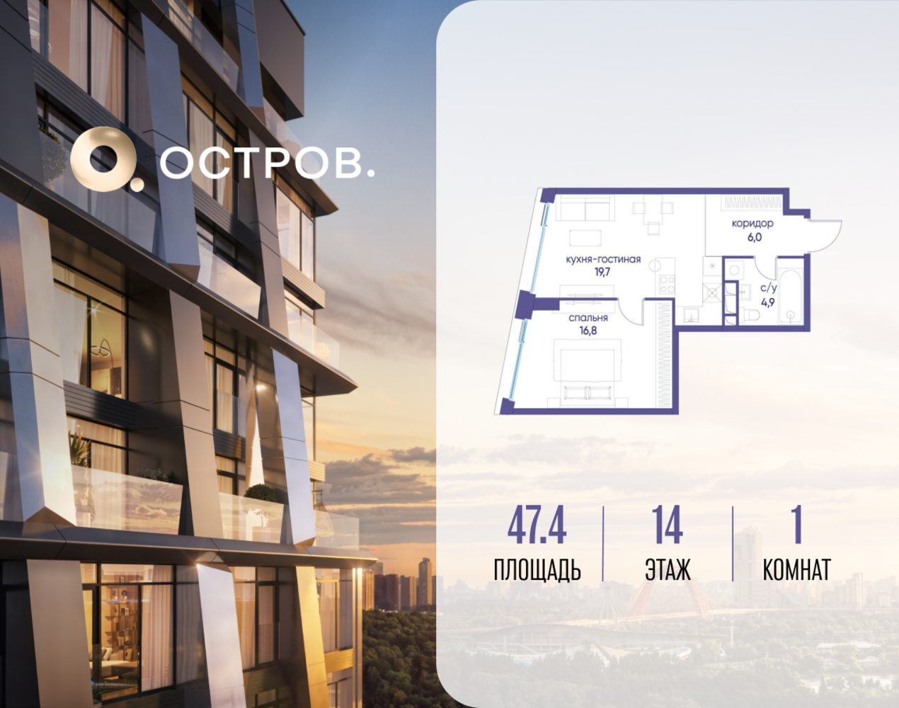 Продаётся однокомнатная квартира от застройщика: общая площадь 47.42 м², жилая 16.80 м², кухня 18.70 м², 14, жилой квартал «Остров 12», корпус 1 (12.1 квартал) (секция 2). срок сдачи: 4-кв. 2025. , 1 совмещенный санузел. В жилой зоне 2 больших окна на одну сторону, хорошая инсоляция. Позвоните сейчас и забронируйте квартиру! Купите квартиру для курортной жизни в Москве в квартале ОСТРОВ.12.1. Это единственный на ОСТРОВЕ квартал бизнес-класса, расположенный на первой линии у реки - здесь царит атмосфера ежедневного отпуска. Дома созданы в узнаваемом футуристичном стиле и выглядят как произведения современного искусства. Для жителей предусмотрены фитнес-рум и детский клуб, гостиная и кинотеатр, переговорные и репетиторские комнаты. На крышах устроены видовые общественные пространства с зонами для йоги, коворкингами, лаунжами. Двор-парк располагает всем необходимым для отдыха и общения всех возрастов. ОСТРОВ.12.1 - часть жилого комплекса на западе Москвы, в 15 минутах езды от центра. Это настоящий заповедник посреди большого города, в окружении реки и 650 га заповедников. Здесь все необходимое находится по соседству: от детского сада до супермаркета, от фитнес-зала до серфинг-центра. На территории созданы все условия для отдыха и общения: клубная инфраструктура в домах и дворы-парки, набережные и променады, маршруты для спортсменов, детей и возрастных жителей. В нескольких минутах ходьбы расположена станция метро "Мнёвники" БКЛ. На автомобиле - 10 минут до Москва-Сити и 15 минут до Садового кольца.