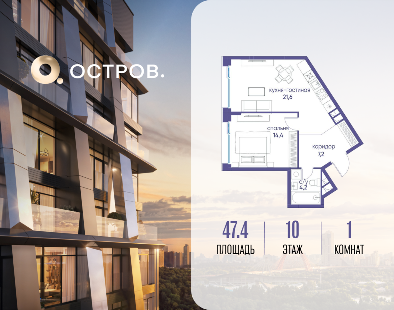 Продаётся однокомнатная квартира от застройщика: общая площадь 47.42 м², жилая 14.40 м², кухня 21.60 м², 10, жилой квартал «Остров 12», корпус 1 (12.1 квартал) (секция 1). срок сдачи: 4-кв. 2025. , 1 совмещенный санузел. В жилой зоне 2 больших окна на одну сторону, хорошая инсоляция. Позвоните сейчас и забронируйте квартиру! Купите квартиру для курортной жизни в Москве в квартале ОСТРОВ.12.1. Это единственный на ОСТРОВЕ квартал бизнес-класса, расположенный на первой линии у реки - здесь царит атмосфера ежедневного отпуска. Дома созданы в узнаваемом футуристичном стиле и выглядят как произведения современного искусства. Для жителей предусмотрены фитнес-рум и детский клуб, гостиная и кинотеатр, переговорные и репетиторские комнаты. На крышах устроены видовые общественные пространства с зонами для йоги, коворкингами, лаунжами. Двор-парк располагает всем необходимым для отдыха и общения всех возрастов. ОСТРОВ.12.1 - часть жилого комплекса на западе Москвы, в 15 минутах езды от центра. Это настоящий заповедник посреди большого города, в окружении реки и 650 га заповедников. Здесь все необходимое находится по соседству: от детского сада до супермаркета, от фитнес-зала до серфинг-центра. На территории созданы все условия для отдыха и общения: клубная инфраструктура в домах и дворы-парки, набережные и променады, маршруты для спортсменов, детей и возрастных жителей. В нескольких минутах ходьбы расположена станция метро "Мнёвники" БКЛ. На автомобиле - 10 минут до Москва-Сити и 15 минут до Садового кольца.