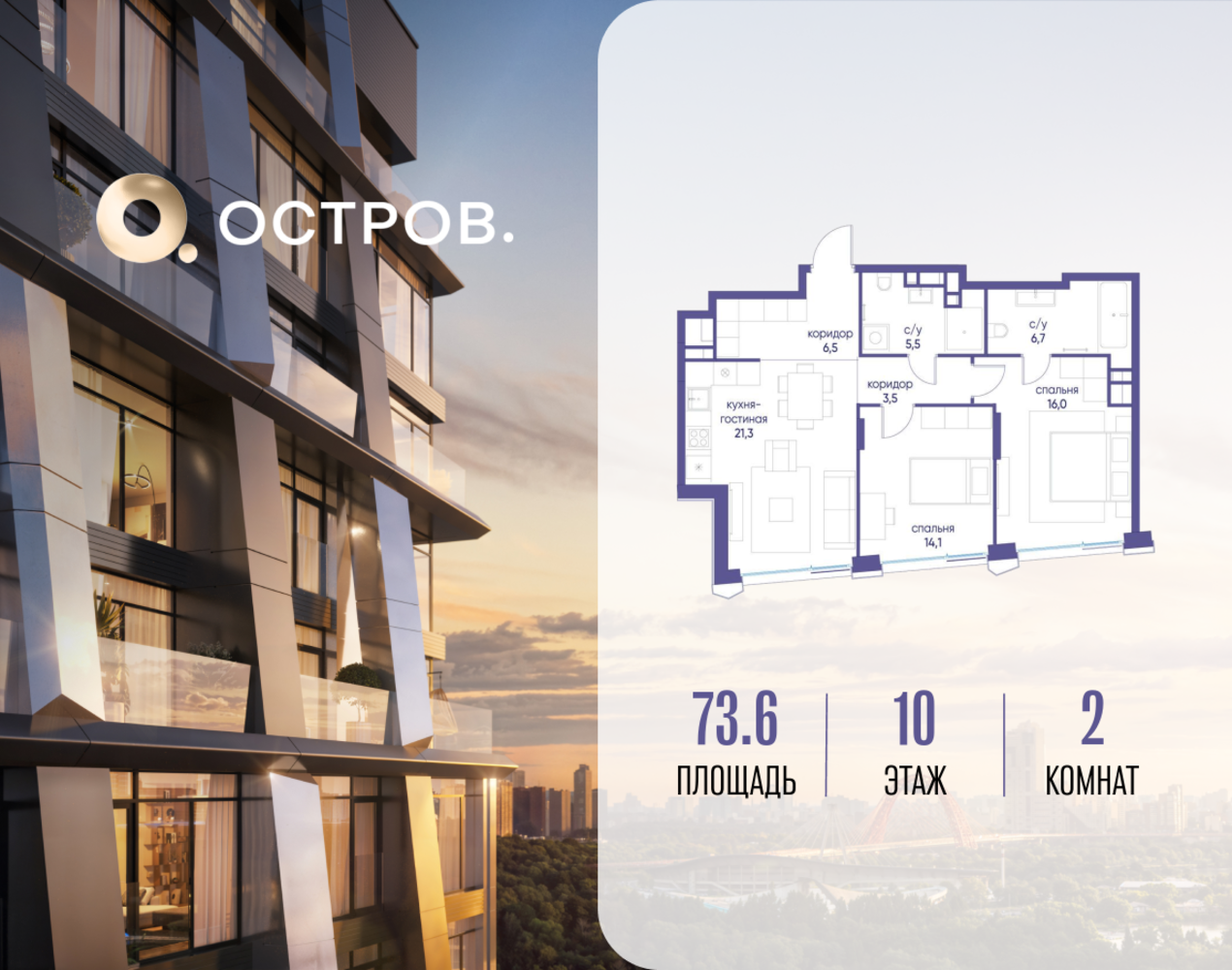 Продаётся 2-комн. квартира от застройщика: общая площадь 73.62 м², жилая 30.10 м², кухня 21.30 м², 10-й этаж, жилой квартал «Остров 12», корпус 2 (секция 1). Срок сдачи: 1 квартал 2029 года. 2 совмещенных санузла. В жилой зоне 2 больших окна на одну сторону, хорошая инсоляция. Позвоните сейчас и забронируйте квартиру! ОСТРОВ от Донстрой — жилой комплекс на западе Москвы, в Мневниковской пойме. Уникальное преимущество комплекса — в том, что он обособлен от города рекой и природным парком (650 га). Благодаря природному окружению эта территория имеет лучший экологический рейтинг в столице. Кварталы ОСТРОВА объединены ландшафтным дизайном в единое пространство — с набережными и Центральным бульваром. На ОСТРОВЕ любые объекты, необходимые для полноценной жизни и отдыха, находятся на расстоянии 15-минутной прогулки. Торговый центр и супермаркеты, кафе и рестораны, фитнес, салоны красоты, школы и детские сады. А также крупнейший в Москве спортивный кластер.