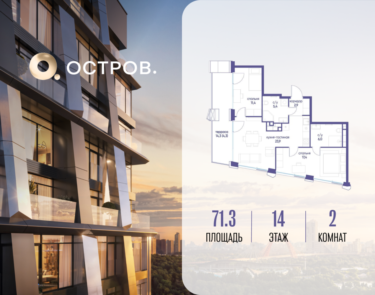 Продаётся 2-комн. квартира от застройщика: общая площадь 71.32 м², жилая 28.80 м², кухня 23.90 м², 14-й этаж, жилой квартал «Остров 12», корпус 2 (секция 1). Срок сдачи: 1 квартал 2029 года. 2 совмещенных санузла. В жилой зоне 2 больших окна на одну сторону, хорошая инсоляция. Позвоните сейчас и забронируйте квартиру! ОСТРОВ от Донстрой — жилой комплекс на западе Москвы, в Мневниковской пойме. Уникальное преимущество комплекса — в том, что он обособлен от города рекой и природным парком (650 га). Благодаря природному окружению эта территория имеет лучший экологический рейтинг в столице. Кварталы ОСТРОВА объединены ландшафтным дизайном в единое пространство — с набережными и Центральным бульваром. На ОСТРОВЕ любые объекты, необходимые для полноценной жизни и отдыха, находятся на расстоянии 15-минутной прогулки. Торговый центр и супермаркеты, кафе и рестораны, фитнес, салоны красоты, школы и детские сады. А также крупнейший в Москве спортивный кластер.