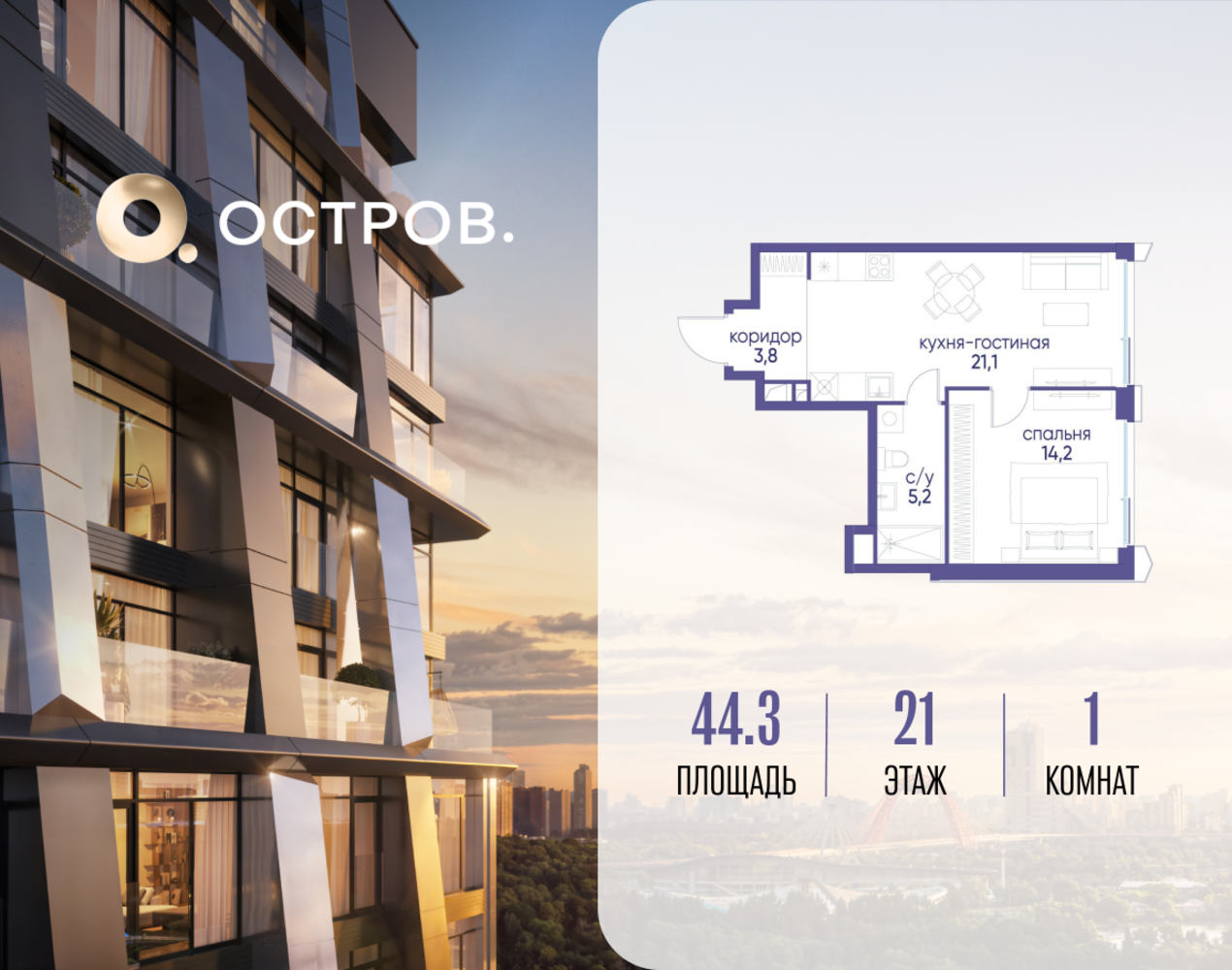 Продаётся однокомнатная квартира от застройщика: общая площадь 44.32 м², жилая 14.20 м², кухня 21.10 м², 21, жилой квартал «Остров 12», корпус 3 (12.1 квартал) (секция 1). срок сдачи: 4-кв. 2025. , 1 совмещенный санузел. В жилой зоне 2 больших окна на одну сторону, хорошая инсоляция. Позвоните сейчас и забронируйте квартиру! Купите квартиру для курортной жизни в Москве в квартале ОСТРОВ.12.1. Это единственный на ОСТРОВЕ квартал бизнес-класса, расположенный на первой линии у реки - здесь царит атмосфера ежедневного отпуска. Дома созданы в узнаваемом футуристичном стиле и выглядят как произведения современного искусства. Для жителей предусмотрены фитнес-рум и детский клуб, гостиная и кинотеатр, переговорные и репетиторские комнаты. На крышах устроены видовые общественные пространства с зонами для йоги, коворкингами, лаунжами. Двор-парк располагает всем необходимым для отдыха и общения всех возрастов. ОСТРОВ.12.1 - часть жилого комплекса на западе Москвы, в 15 минутах езды от центра. Это настоящий заповедник посреди большого города, в окружении реки и 650 га заповедников. Здесь все необходимое находится по соседству: от детского сада до супермаркета, от фитнес-зала до серфинг-центра. На территории созданы все условия для отдыха и общения: клубная инфраструктура в домах и дворы-парки, набережные и променады, маршруты для спортсменов, детей и возрастных жителей. В нескольких минутах ходьбы расположена станция метро "Мнёвники" БКЛ. На автомобиле - 10 минут до Москва-Сити и 15 минут до Садового кольца.