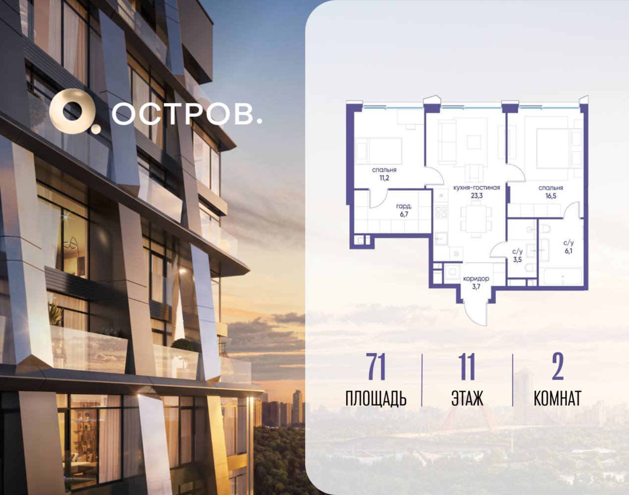 Продаётся 2-комн. квартира от застройщика: общая площадь 71.02 м², жилая 27.70 м², кухня 23.30 м², 11-й этаж, жилой квартал «Остров 12», корпус 2 (секция 1). Срок сдачи: 1 квартал 2029 года. 2 совмещенных санузла. В жилой зоне 2 больших окна на одну сторону, хорошая инсоляция. Позвоните сейчас и забронируйте квартиру! ОСТРОВ от Донстрой — жилой комплекс на западе Москвы, в Мневниковской пойме. Уникальное преимущество комплекса — в том, что он обособлен от города рекой и природным парком (650 га). Благодаря природному окружению эта территория имеет лучший экологический рейтинг в столице. Кварталы ОСТРОВА объединены ландшафтным дизайном в единое пространство — с набережными и Центральным бульваром. На ОСТРОВЕ любые объекты, необходимые для полноценной жизни и отдыха, находятся на расстоянии 15-минутной прогулки. Торговый центр и супермаркеты, кафе и рестораны, фитнес, салоны красоты, школы и детские сады. А также крупнейший в Москве спортивный кластер.