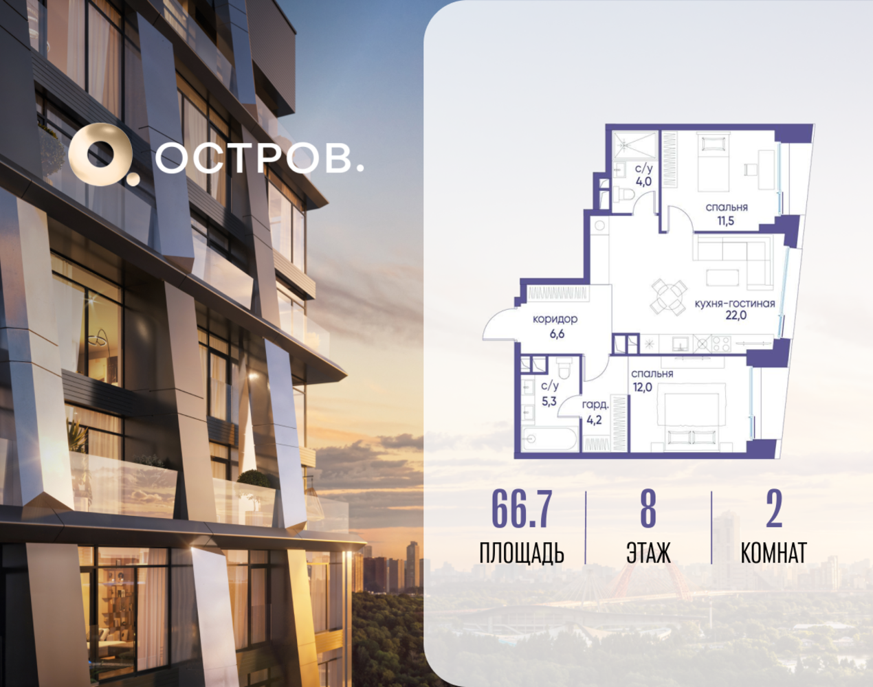 Продаётся двухкомнатная квартира от застройщика: общая площадь 66.72 м², жилая 23.50 м², кухня 22.00 м², 8, жилой квартал «Остров 12», корпус 1 (12.1 квартал) (секция 2). срок сдачи: 4-кв. 2025. , 2 санузла: 2 совмещенных. В жилой зоне 2 больших окна на одну сторону, хорошая инсоляция. Позвоните сейчас и забронируйте квартиру! Купите квартиру для курортной жизни в Москве в квартале ОСТРОВ.12.1. Это единственный на ОСТРОВЕ квартал бизнес-класса, расположенный на первой линии у реки - здесь царит атмосфера ежедневного отпуска. Дома созданы в узнаваемом футуристичном стиле и выглядят как произведения современного искусства. Для жителей предусмотрены фитнес-рум и детский клуб, гостиная и кинотеатр, переговорные и репетиторские комнаты. На крышах устроены видовые общественные пространства с зонами для йоги, коворкингами, лаунжами. Двор-парк располагает всем необходимым для отдыха и общения всех возрастов. ОСТРОВ.12.1 - часть жилого комплекса на западе Москвы, в 15 минутах езды от центра. Это настоящий заповедник посреди большого города, в окружении реки и 650 га заповедников. Здесь все необходимое находится по соседству: от детского сада до супермаркета, от фитнес-зала до серфинг-центра. На территории созданы все условия для отдыха и общения: клубная инфраструктура в домах и дворы-парки, набережные и променады, маршруты для спортсменов, детей и возрастных жителей. В нескольких минутах ходьбы расположена станция метро "Мнёвники" БКЛ. На автомобиле - 10 минут до Москва-Сити и 15 минут до Садового кольца.