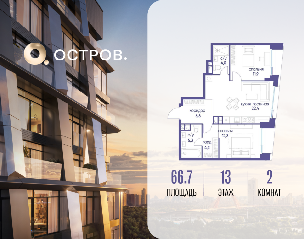 Продаётся двухкомнатная квартира от застройщика: общая площадь 66.72 м², жилая 24.20 м², кухня 22.40 м², 13, жилой квартал «Остров 12», корпус 1 (12.1 квартал) (секция 2). срок сдачи: 4-кв. 2025. , 2 санузла: 2 совмещенных. В жилой зоне 2 больших окна на одну сторону, хорошая инсоляция. Позвоните сейчас и забронируйте квартиру! Купите квартиру для курортной жизни в Москве в квартале ОСТРОВ.12.1. Это единственный на ОСТРОВЕ квартал бизнес-класса, расположенный на первой линии у реки - здесь царит атмосфера ежедневного отпуска. Дома созданы в узнаваемом футуристичном стиле и выглядят как произведения современного искусства. Для жителей предусмотрены фитнес-рум и детский клуб, гостиная и кинотеатр, переговорные и репетиторские комнаты. На крышах устроены видовые общественные пространства с зонами для йоги, коворкингами, лаунжами. Двор-парк располагает всем необходимым для отдыха и общения всех возрастов. ОСТРОВ.12.1 - часть жилого комплекса на западе Москвы, в 15 минутах езды от центра. Это настоящий заповедник посреди большого города, в окружении реки и 650 га заповедников. Здесь все необходимое находится по соседству: от детского сада до супермаркета, от фитнес-зала до серфинг-центра. На территории созданы все условия для отдыха и общения: клубная инфраструктура в домах и дворы-парки, набережные и променады, маршруты для спортсменов, детей и возрастных жителей. В нескольких минутах ходьбы расположена станция метро "Мнёвники" БКЛ. На автомобиле - 10 минут до Москва-Сити и 15 минут до Садового кольца.