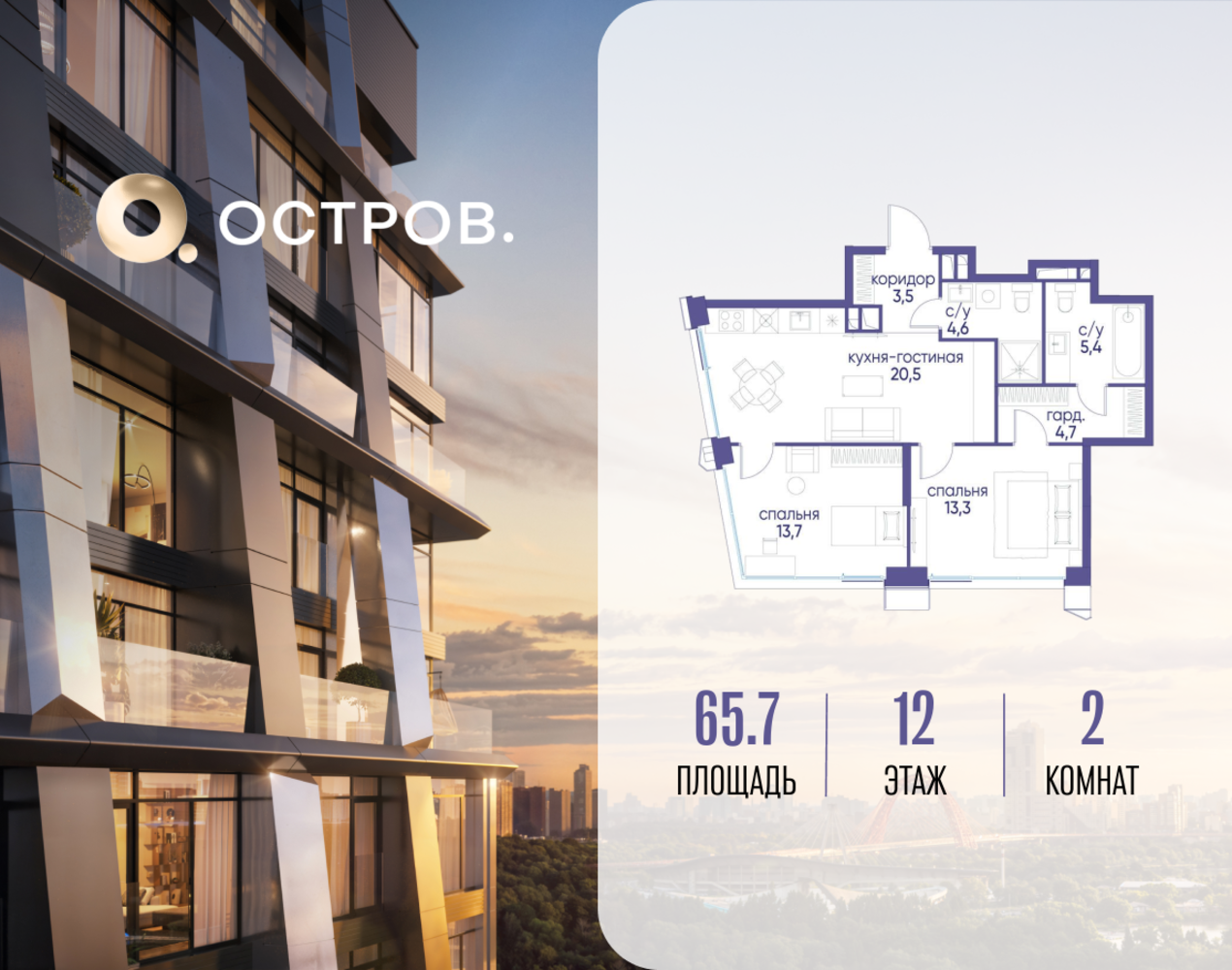 Продаётся двухкомнатная квартира от застройщика: общая площадь 65.72 м², жилая 27.00 м², кухня 20.50 м², 12, жилой квартал «Остров 12», корпус 3 (12.1 квартал) (секция 1). срок сдачи: 4-кв. 2025. , 2 санузла: 2 совмещенных. В жилой зоне 2 больших окна на одну сторону, хорошая инсоляция. Позвоните сейчас и забронируйте квартиру! Купите квартиру для курортной жизни в Москве в квартале ОСТРОВ.12.1. Это единственный на ОСТРОВЕ квартал бизнес-класса, расположенный на первой линии у реки - здесь царит атмосфера ежедневного отпуска. Дома созданы в узнаваемом футуристичном стиле и выглядят как произведения современного искусства. Для жителей предусмотрены фитнес-рум и детский клуб, гостиная и кинотеатр, переговорные и репетиторские комнаты. На крышах устроены видовые общественные пространства с зонами для йоги, коворкингами, лаунжами. Двор-парк располагает всем необходимым для отдыха и общения всех возрастов. ОСТРОВ.12.1 - часть жилого комплекса на западе Москвы, в 15 минутах езды от центра. Это настоящий заповедник посреди большого города, в окружении реки и 650 га заповедников. Здесь все необходимое находится по соседству: от детского сада до супермаркета, от фитнес-зала до серфинг-центра. На территории созданы все условия для отдыха и общения: клубная инфраструктура в домах и дворы-парки, набережные и променады, маршруты для спортсменов, детей и возрастных жителей. В нескольких минутах ходьбы расположена станция метро "Мнёвники" БКЛ. На автомобиле - 10 минут до Москва-Сити и 15 минут до Садового кольца.