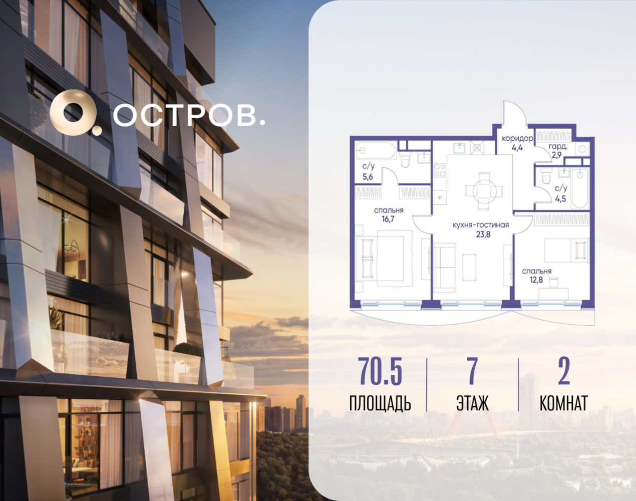 Продаётся 2-комн. квартира от застройщика: общая площадь 70.52 м², жилая 29.50 м², кухня 23.80 м², 7-й этаж, жилой квартал «Остров 12», корпус 4 (секция 1). Срок сдачи: 1 квартал 2029 года. 2 совмещенных санузла. В жилой зоне 2 больших окна на одну сторону, хорошая инсоляция. Позвоните сейчас и забронируйте квартиру! ОСТРОВ от Донстрой — жилой комплекс на западе Москвы, в Мневниковской пойме. Уникальное преимущество комплекса — в том, что он обособлен от города рекой и природным парком (650 га). Благодаря природному окружению эта территория имеет лучший экологический рейтинг в столице. Кварталы ОСТРОВА объединены ландшафтным дизайном в единое пространство — с набережными и Центральным бульваром. На ОСТРОВЕ любые объекты, необходимые для полноценной жизни и отдыха, находятся на расстоянии 15-минутной прогулки. Торговый центр и супермаркеты, кафе и рестораны, фитнес, салоны красоты, школы и детские сады. А также крупнейший в Москве спортивный кластер.