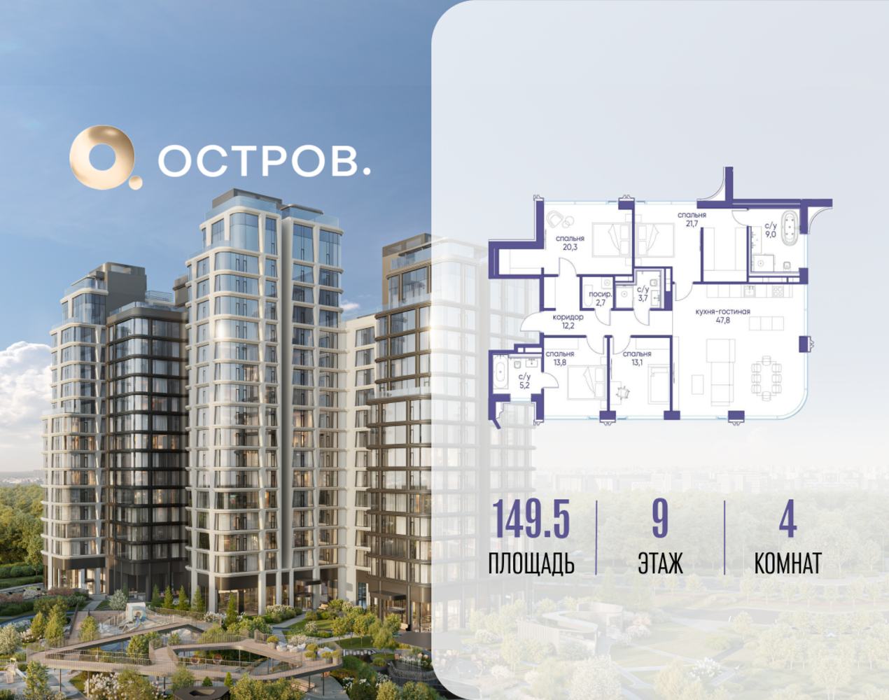 Продаётся 4-комн. квартира от застройщика: общая площадь 149.52 м², жилая 68.90 м², кухня 47.80 м², 9-й этаж, жилой квартал «Остров 12», корпус 2 (секция 1). Срок сдачи: 1 квартал 2029 года. 3 совмещенных санузла. В жилой зоне 2 больших окна на одну сторону, хорошая инсоляция. Позвоните сейчас и забронируйте квартиру! ОСТРОВ от Донстрой — жилой комплекс на западе Москвы, в Мневниковской пойме. Уникальное преимущество комплекса — в том, что он обособлен от города рекой и природным парком (650 га). Благодаря природному окружению эта территория имеет лучший экологический рейтинг в столице. Кварталы ОСТРОВА объединены ландшафтным дизайном в единое пространство — с набережными и Центральным бульваром. На ОСТРОВЕ любые объекты, необходимые для полноценной жизни и отдыха, находятся на расстоянии 15-минутной прогулки. Торговый центр и супермаркеты, кафе и рестораны, фитнес, салоны красоты, школы и детские сады. А также крупнейший в Москве спортивный кластер.