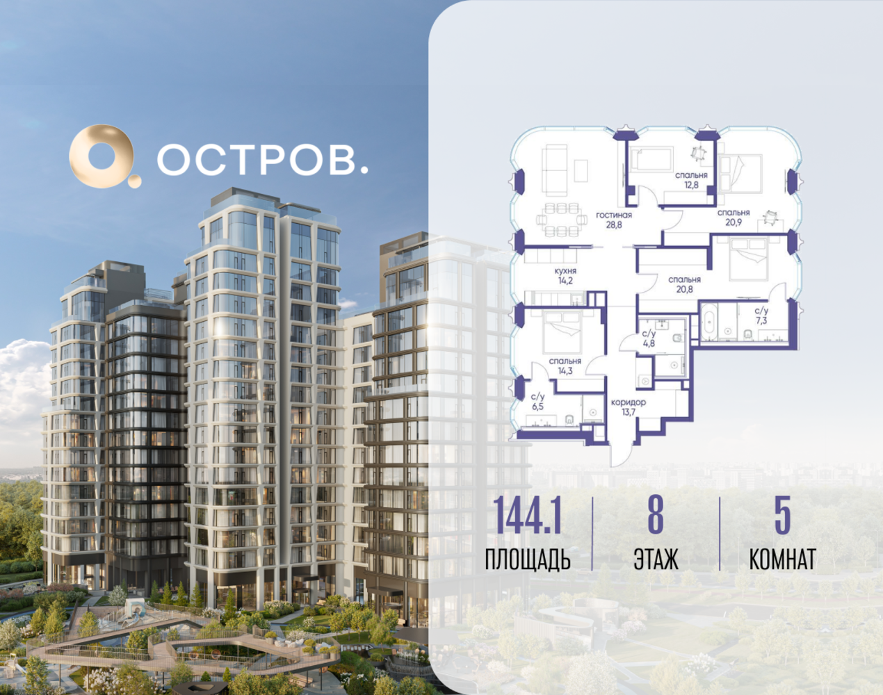 Продаётся квартира от застройщика: общая площадь 144.12 м², жилая 97.60 м², кухня 14.20 м², 8-й этаж, жилой квартал «Остров 12», корпус 2 (секция 1). Срок сдачи: 1 квартал 2029 года. 3 совмещенных санузла. В жилой зоне 2 больших окна на одну сторону, хорошая инсоляция. Позвоните сейчас и забронируйте квартиру! ОСТРОВ от Донстрой — жилой комплекс на западе Москвы, в Мневниковской пойме. Уникальное преимущество комплекса — в том, что он обособлен от города рекой и природным парком (650 га). Благодаря природному окружению эта территория имеет лучший экологический рейтинг в столице. Кварталы ОСТРОВА объединены ландшафтным дизайном в единое пространство — с набережными и Центральным бульваром. На ОСТРОВЕ любые объекты, необходимые для полноценной жизни и отдыха, находятся на расстоянии 15-минутной прогулки. Торговый центр и супермаркеты, кафе и рестораны, фитнес, салоны красоты, школы и детские сады. А также крупнейший в Москве спортивный кластер.