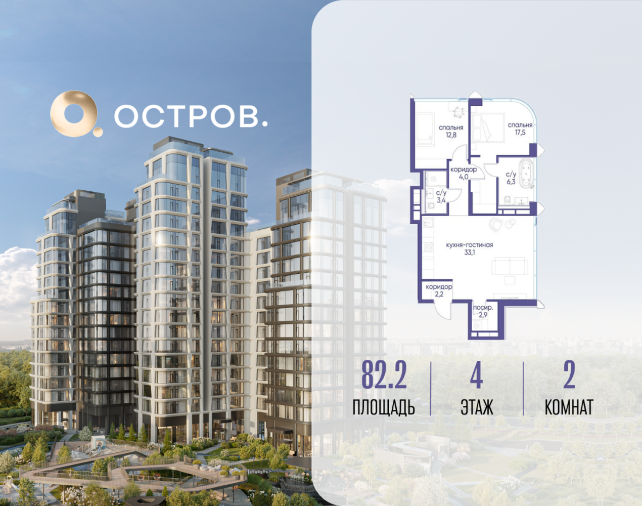 Продаётся 2-комн. квартира от застройщика: общая площадь 82.22 м², жилая 30.30 м², кухня 33.10 м², 4-й этаж, жилой квартал «Остров 12», корпус 2 (секция 2). Срок сдачи: 1 квартал 2029 года. 2 совмещенных санузла. В жилой зоне 2 больших окна на одну сторону, хорошая инсоляция. Позвоните сейчас и забронируйте квартиру! ОСТРОВ от Донстрой — жилой комплекс на западе Москвы, в Мневниковской пойме. Уникальное преимущество комплекса — в том, что он обособлен от города рекой и природным парком (650 га). Благодаря природному окружению эта территория имеет лучший экологический рейтинг в столице. Кварталы ОСТРОВА объединены ландшафтным дизайном в единое пространство — с набережными и Центральным бульваром. На ОСТРОВЕ любые объекты, необходимые для полноценной жизни и отдыха, находятся на расстоянии 15-минутной прогулки. Торговый центр и супермаркеты, кафе и рестораны, фитнес, салоны красоты, школы и детские сады. А также крупнейший в Москве спортивный кластер.
