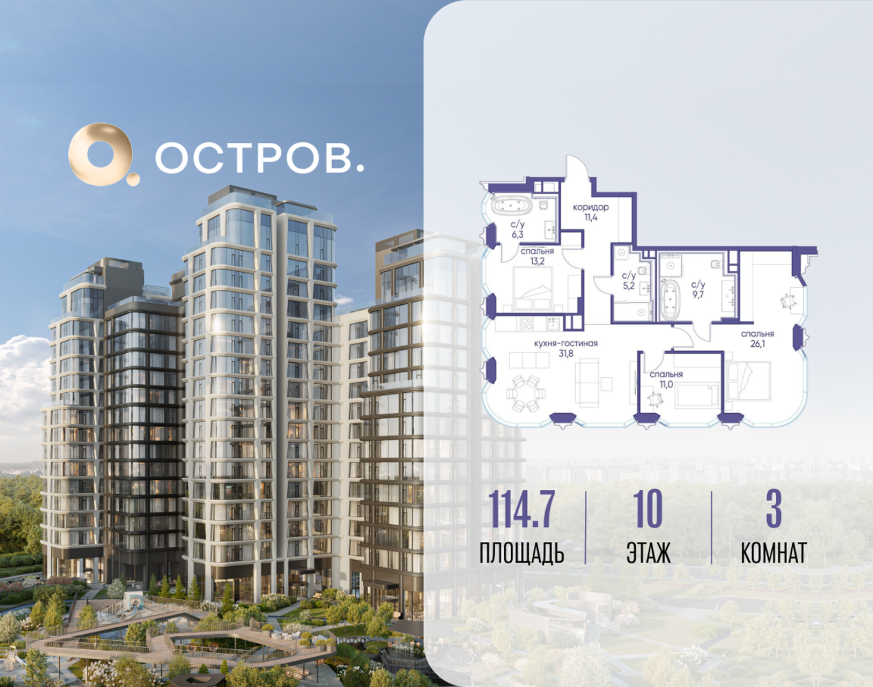 Продаётся 3-комн. квартира от застройщика: общая площадь 114.72 м², жилая 50.30 м², кухня 31.80 м², 10-й этаж, жилой квартал «Остров 12», корпус 2 (секция 1). Срок сдачи: 1 квартал 2029 года. 3 совмещенных санузла. В жилой зоне 2 больших окна на одну сторону, хорошая инсоляция. Позвоните сейчас и забронируйте квартиру! ОСТРОВ от Донстрой — жилой комплекс на западе Москвы, в Мневниковской пойме. Уникальное преимущество комплекса — в том, что он обособлен от города рекой и природным парком (650 га). Благодаря природному окружению эта территория имеет лучший экологический рейтинг в столице. Кварталы ОСТРОВА объединены ландшафтным дизайном в единое пространство — с набережными и Центральным бульваром. На ОСТРОВЕ любые объекты, необходимые для полноценной жизни и отдыха, находятся на расстоянии 15-минутной прогулки. Торговый центр и супермаркеты, кафе и рестораны, фитнес, салоны красоты, школы и детские сады. А также крупнейший в Москве спортивный кластер.